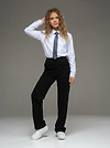 Классические брюки из футера черного цвета для девочки прямого силуэта с застроченной складкой-стрелкой и боковыми карманами. Пояс цельнокроенный на резинке. Изделие выполнено из трикотажа премиального качества - ПЕНЬЕ, с содержанием хлопка более 92%