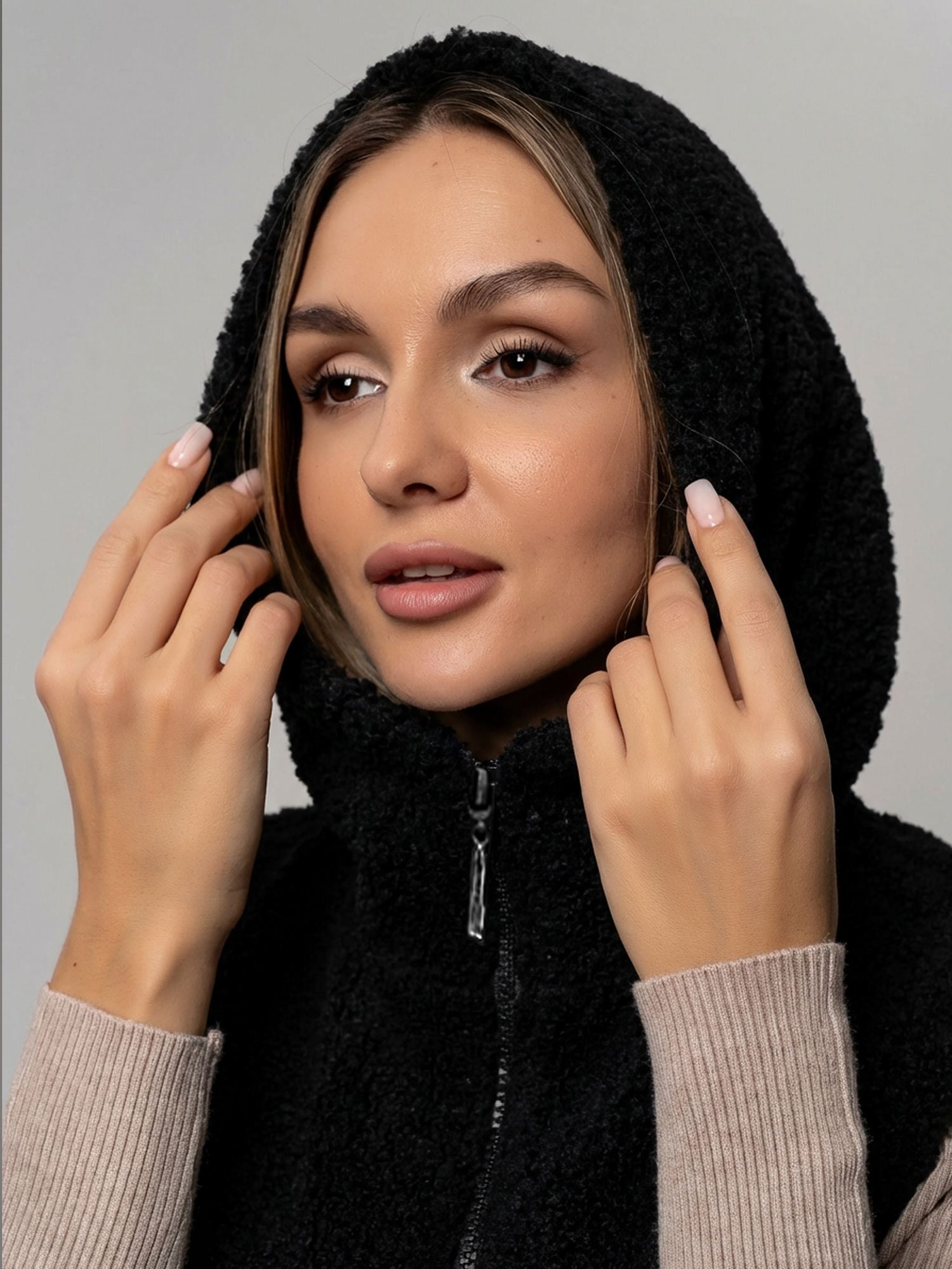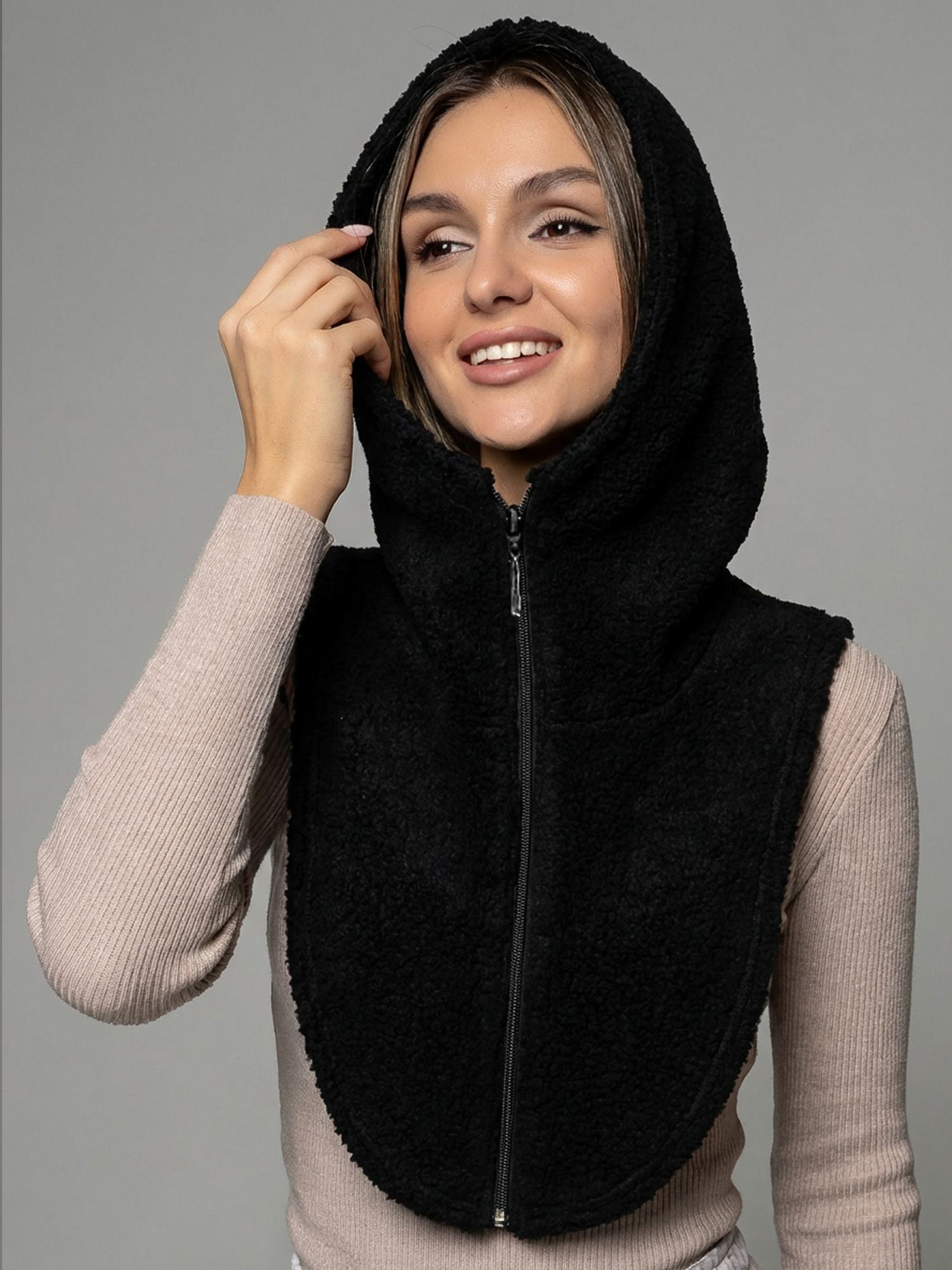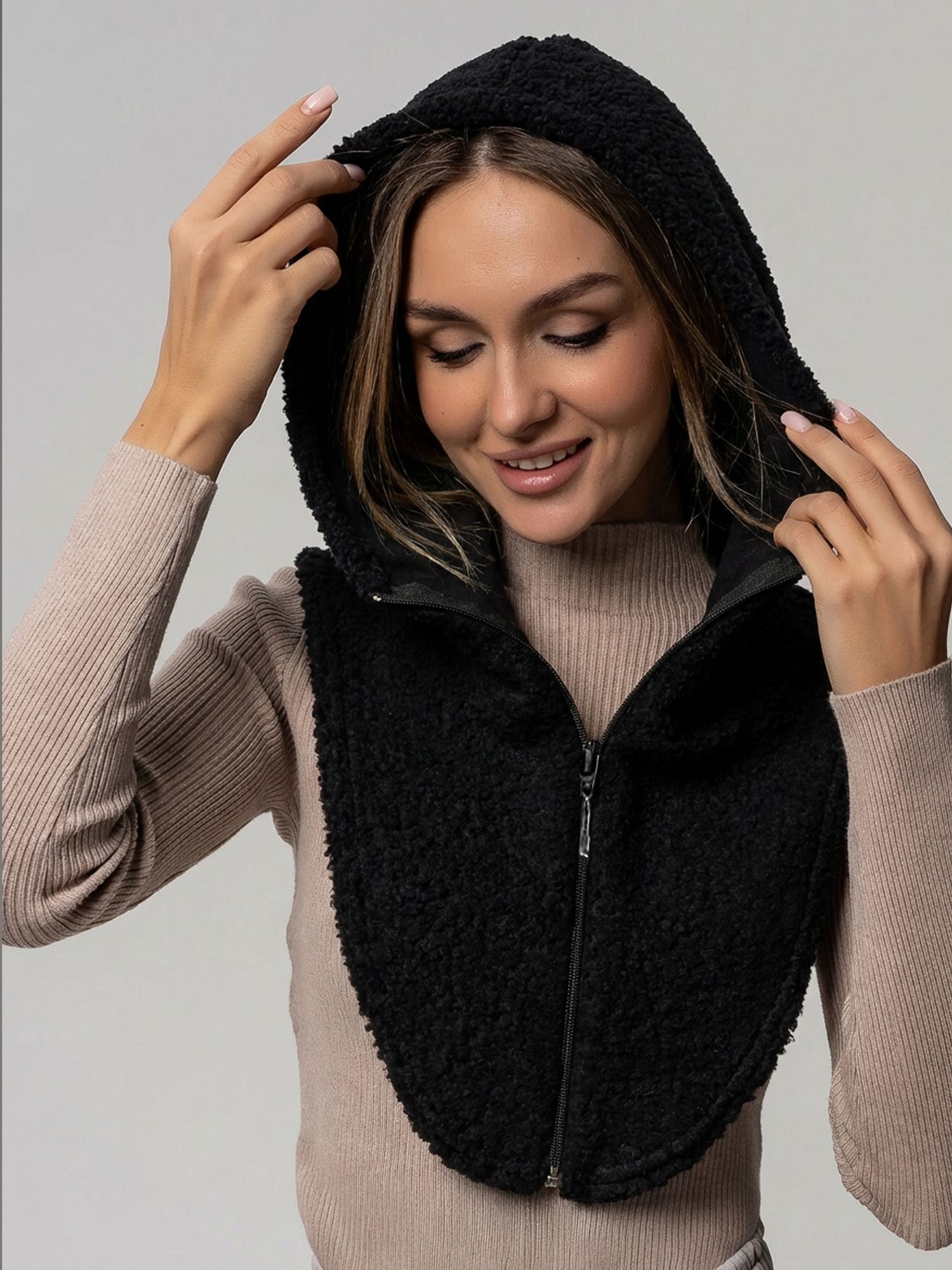 Капор женский на молнии из шерпа черного цвета - тренд сезона. Это универсальный головной убор, который сочетается с любой верхней одеждой, создавая стильный образ. Это отличная замена шапке, платку и шарфу, надежно закрывает шею и грудь от холодного воздуха. Плюшевый теплый капор из шерпы - идеален для длительных прогулок на свежем воздухе, путешествий, занятий спортом. В нем можно каждый день ходить на работу в офис, на учебу в школу или в институт. Не имеет ограничений по возрасту, подходит как взрослым, так и подросткам для повседневного, спортивного, городского, молодежного стиля. Капор-манишку можно взять с собой и надеть в случае непогоды весной и осенью.
