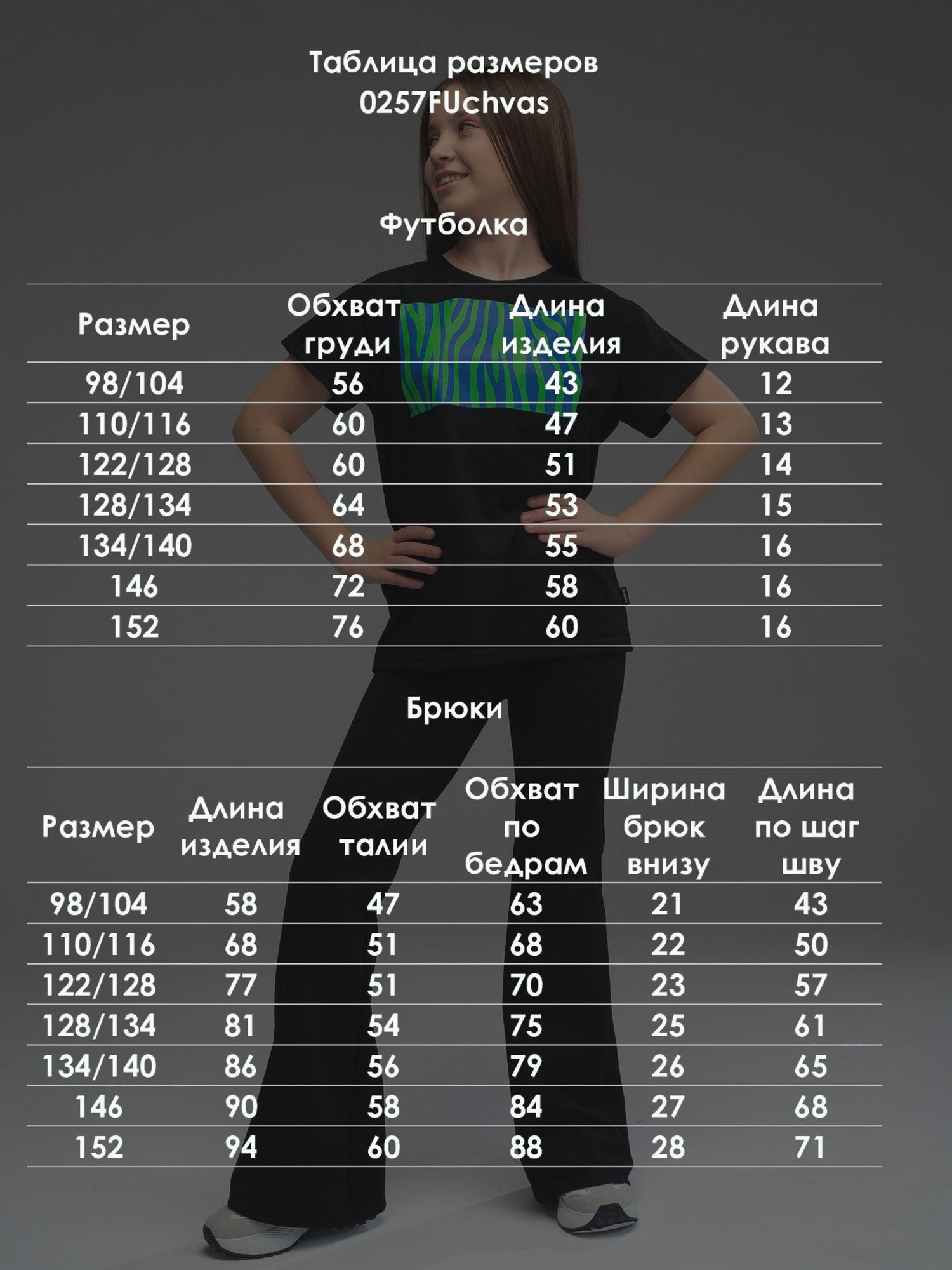 Костюм двойка для девочки из футера черного цвета для девочки состоит из футболки свободного силуэта со спущенной линией плеча, рукавами до уровня локтя и брюк- клеш. На груди футболки- яркий анималистичный принт. Костюм двойка- это отличный выбор для создания модного и стильного летнего образа. Превосходное сочетание практичности и удобства, этот костюм станет незаменимым элементом гардероба Вашей девочки. Привлекательный, летний дизайн и свободная посадка обеспечивают комфорт даже в самые жаркие дни.