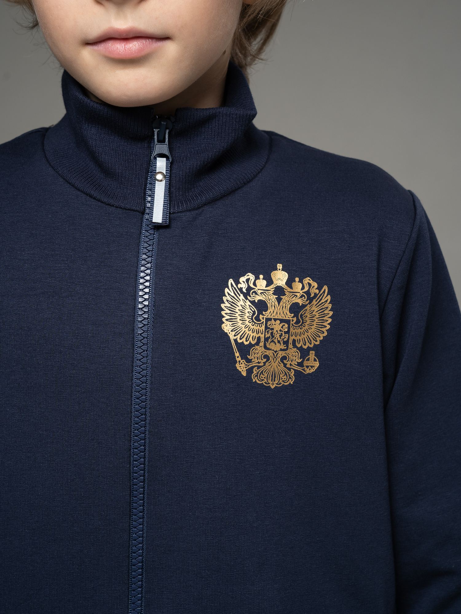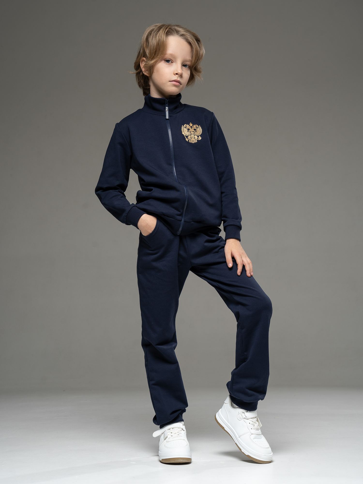 Отличный костюм из футера темно-синего цвета , состоящий из джемпера на молнии, с боковыми карманами и брюк с манжетами снизу. Изделие выполнено из трикотажа премиального качества - ПЕНЬЕ, с содержанием хлопка более 92%