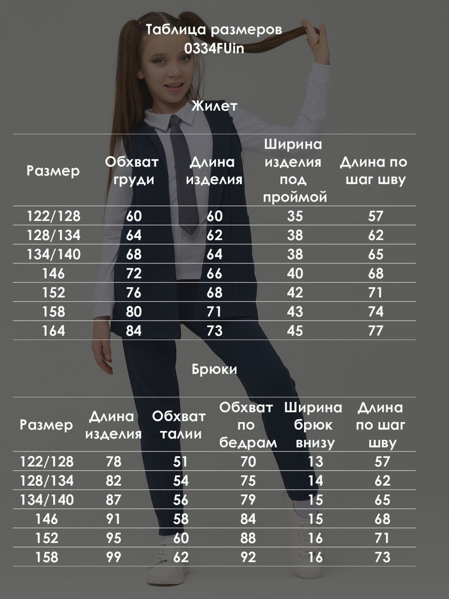 Школьный костюм из футера синего(индиго) цвета для девочки , состоит из жилета и брюк. Жилет без застежки, с боковыми разрезами и боковыми карманами. Длиной до середины бедра. Брюки зауженные с боковыми карманами. Спереди - отделка в виде застроченной стрелки. Пояс на удобной эластичной резинке. Изделие выполнено из трикотажа премиального качества - ПЕНЬЕ, с содержанием хлопка более 92%