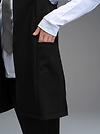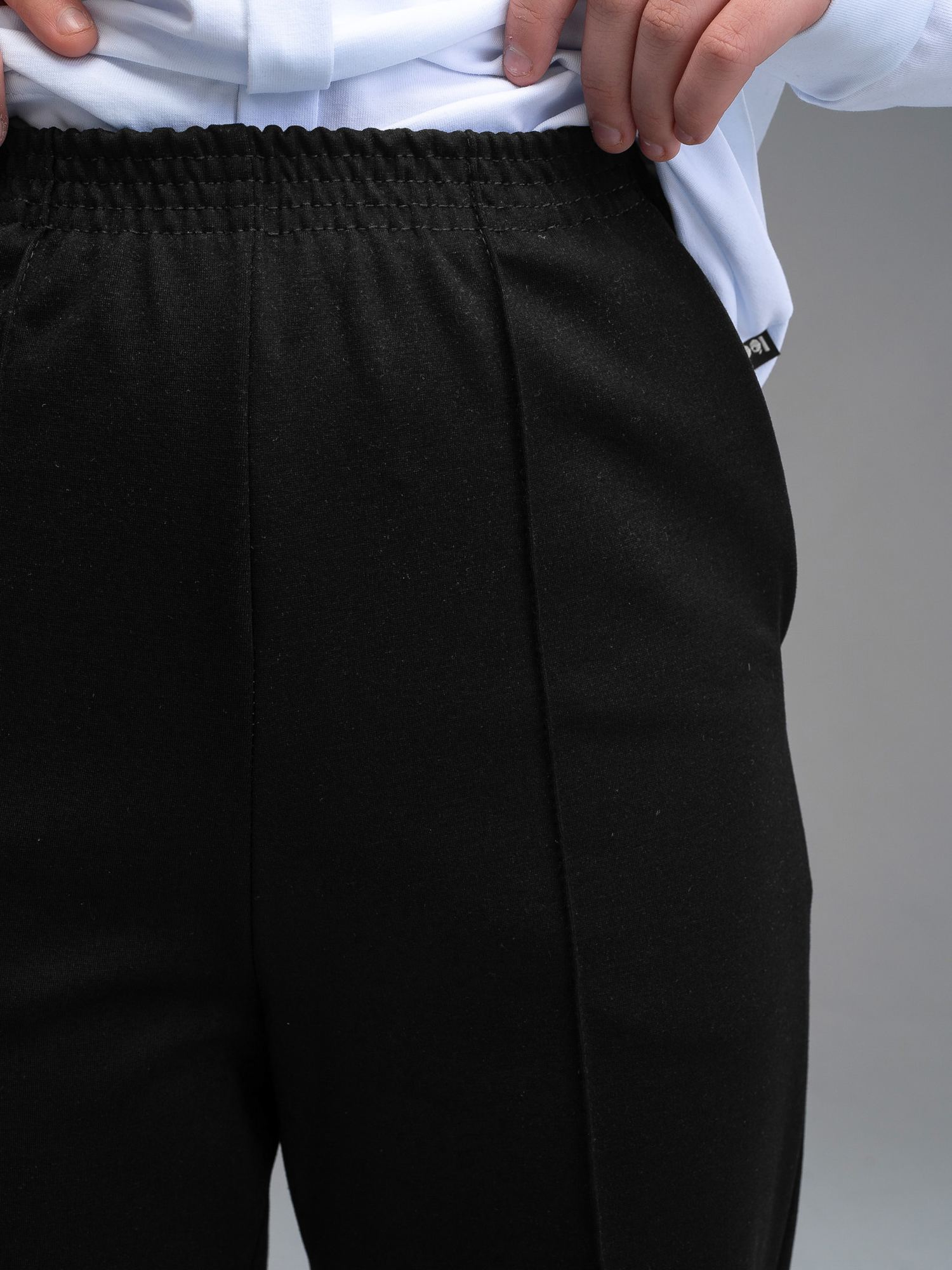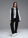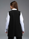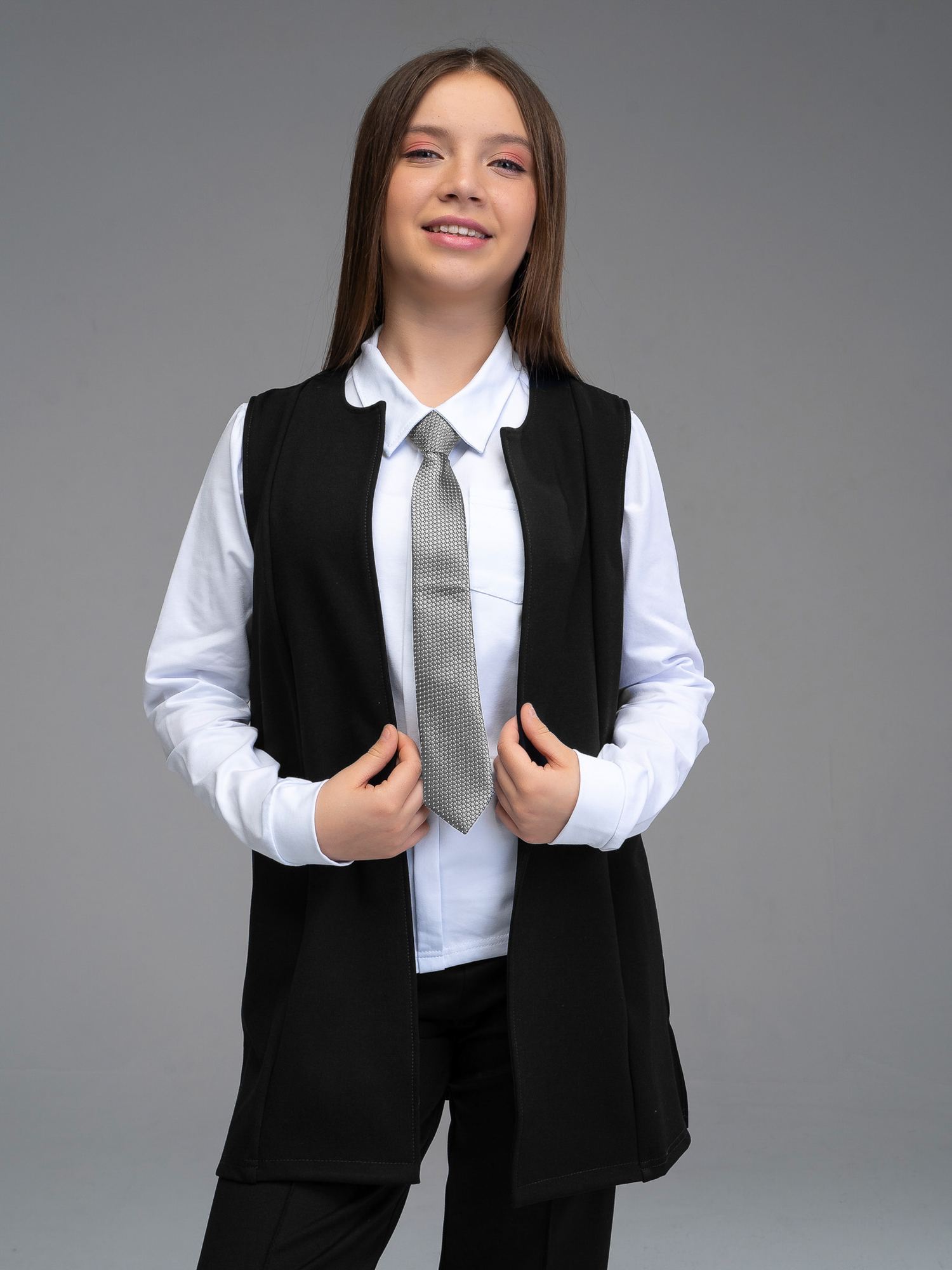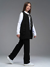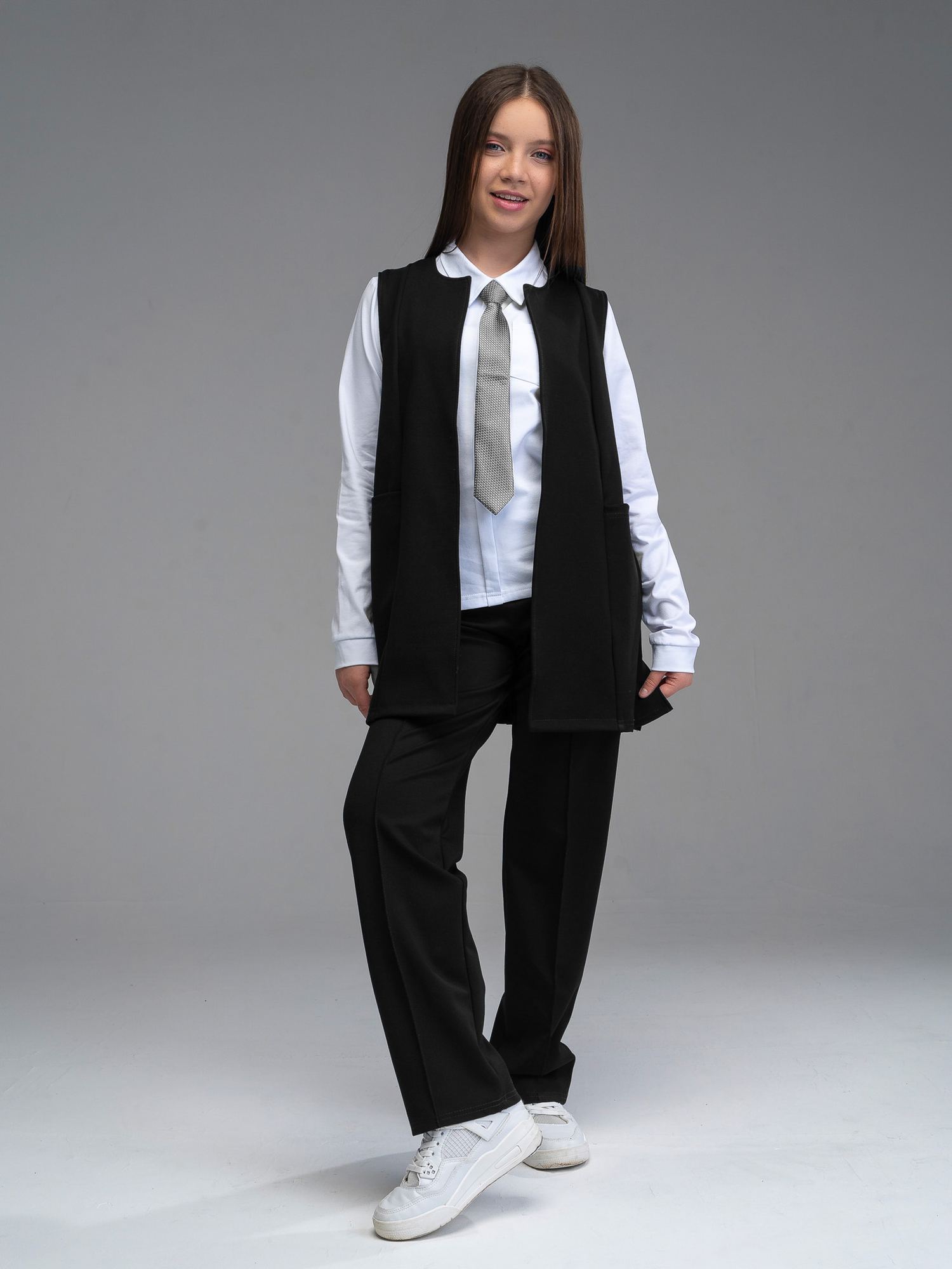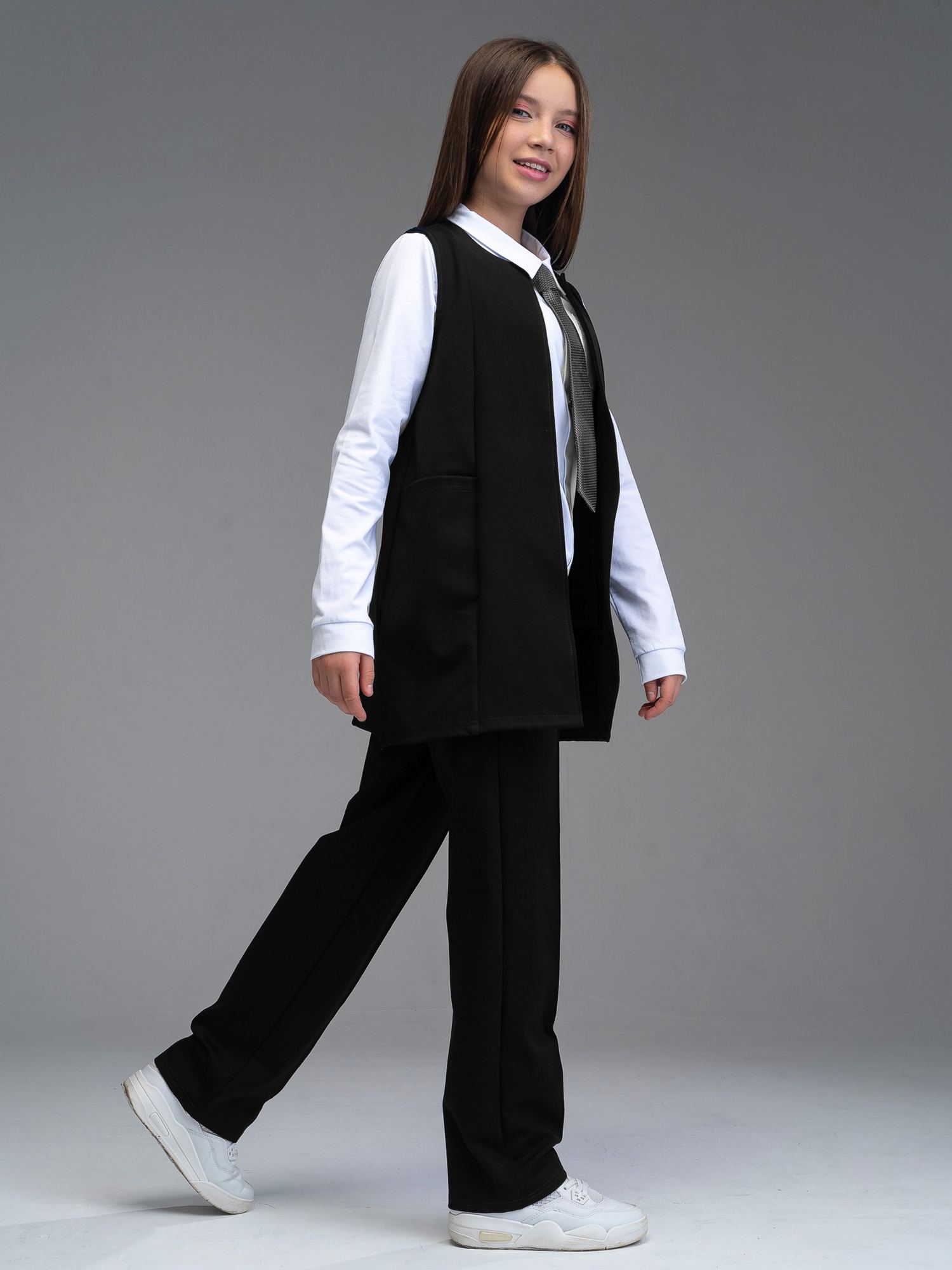 Школьный костюм из джерси черного цвета для девочки , состоит из жилета и брюк. Жилет без застежки, с боковыми разрезами и боковыми карманами. Длиной до середины бедра. Брюки зауженные с боковыми карманами. Спереди - отделка в виде застроченной стрелки. Пояс на удобной эластичной резинке.