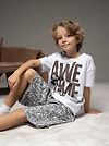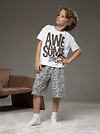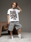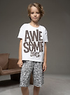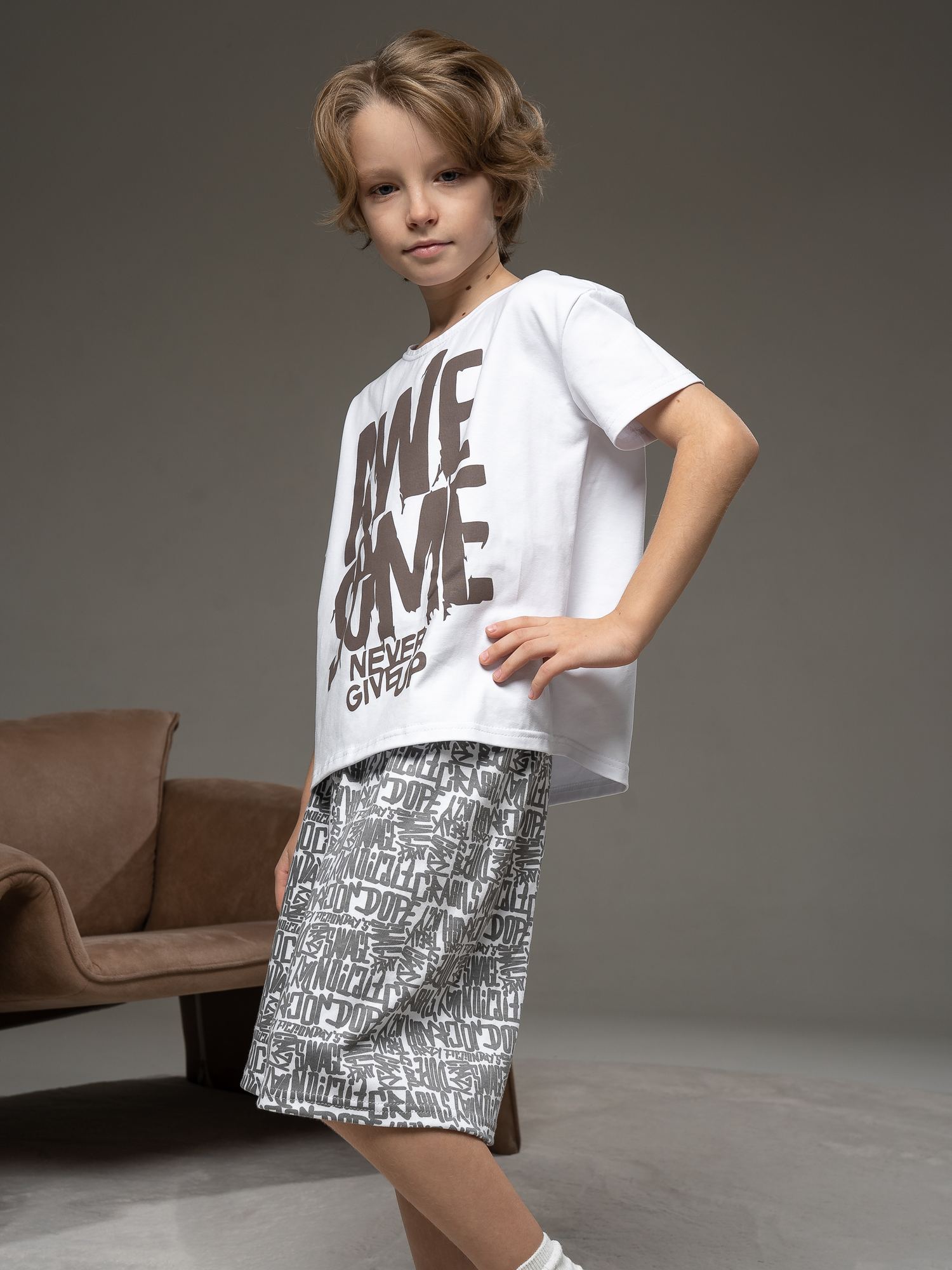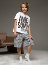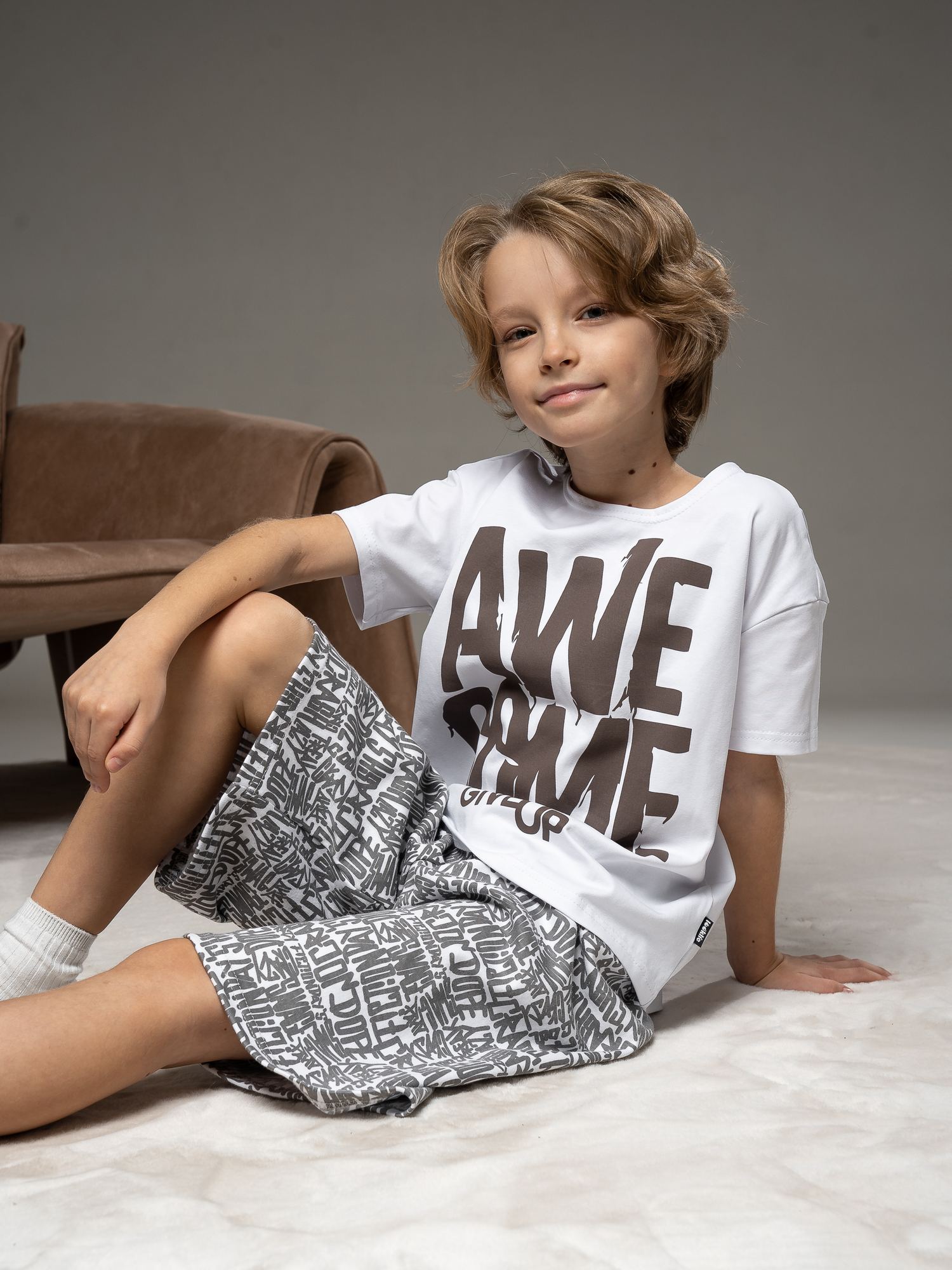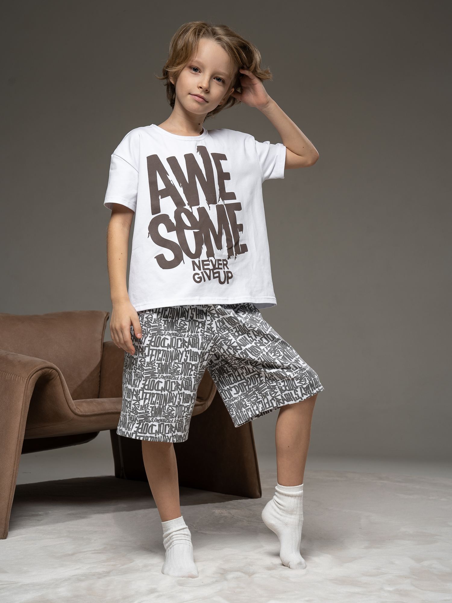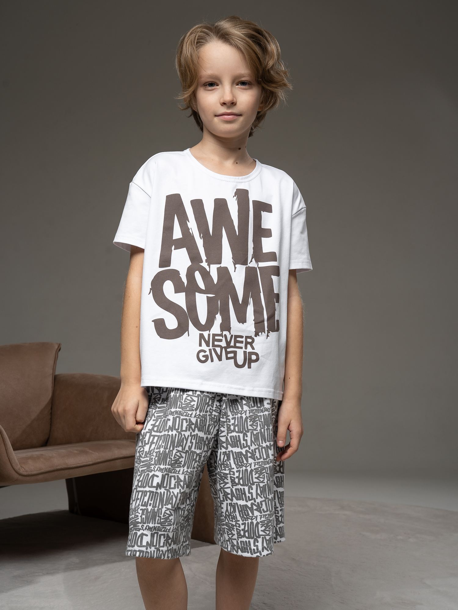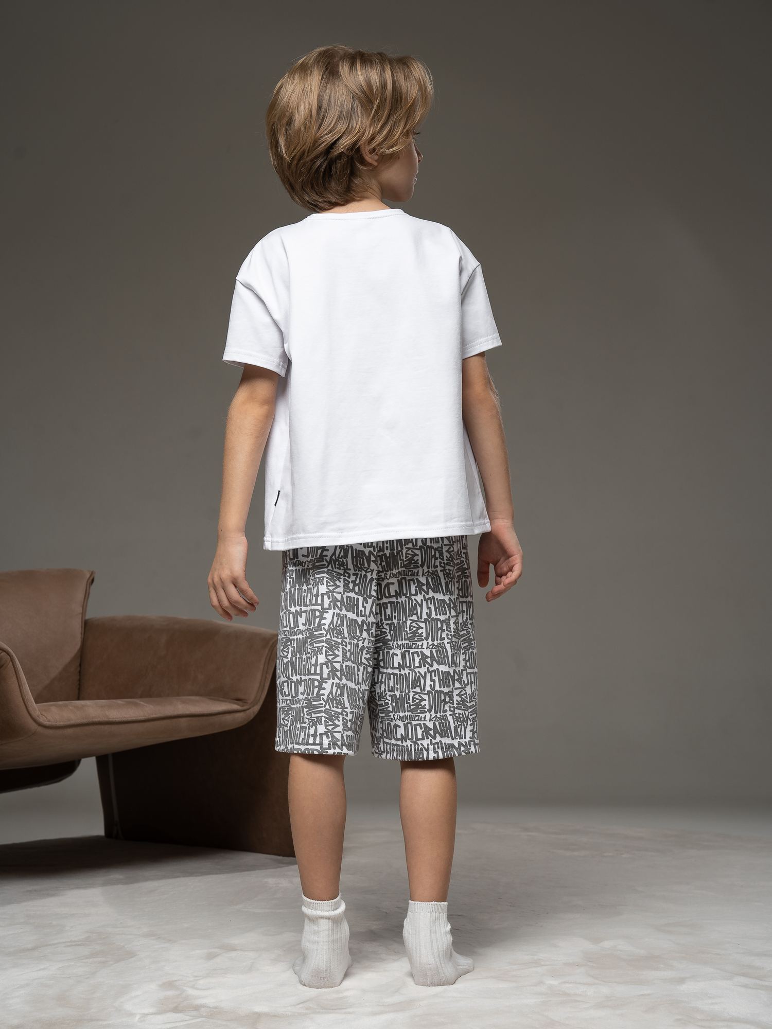 Пижама из интерлока серого цвета свободного силуэта . Состоит из футболки и шорт Футболка с расширенной линией плеча, округлой горловиной и короткими рукавами. Удлиненные шорты с цельнокроенным поясом на резинке без бокового шва.