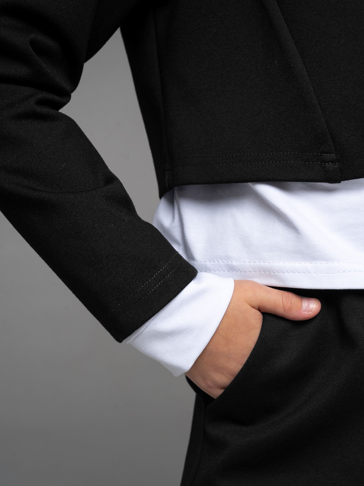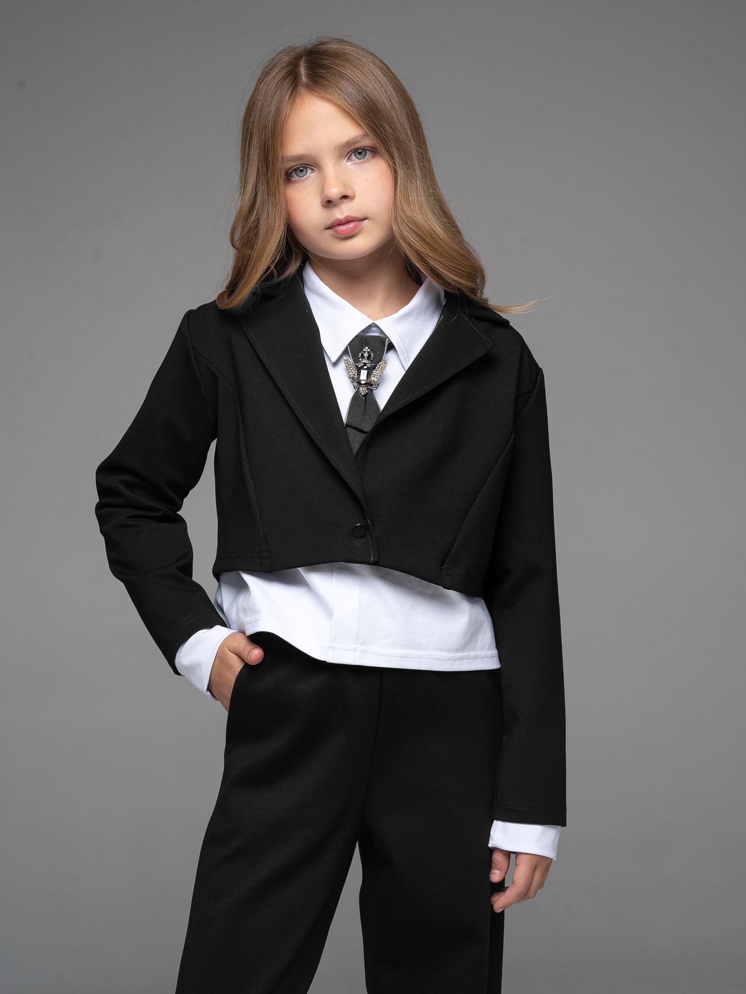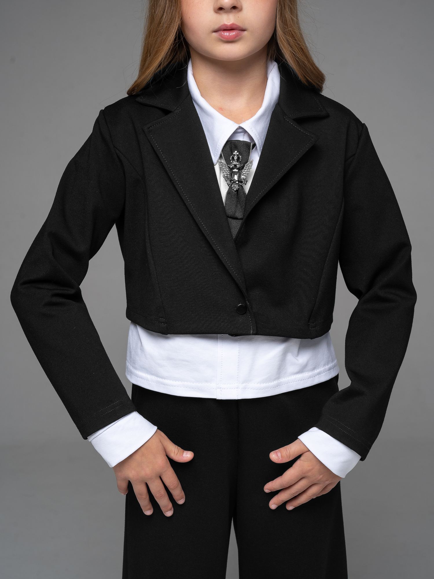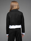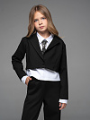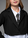 "Школьные будни – не просто обязанность, но и возможность проявить стиль и индивидуальность. Идеальным дополнением школьного гардероба вашей малышки станет укороченный пиджак из джерси черного цвета для девочки .