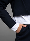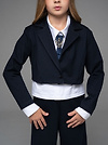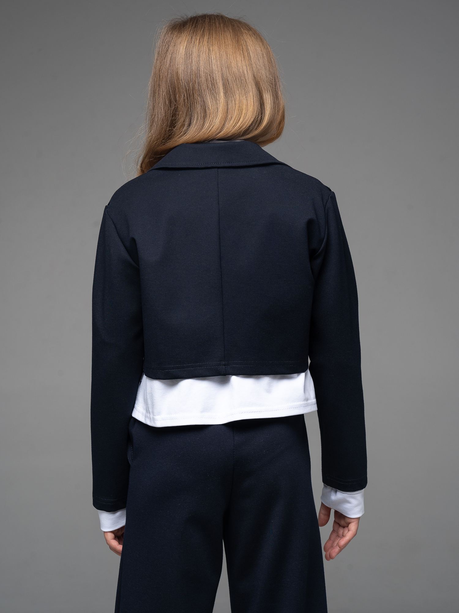 "Школьные будни – не просто обязанность, но и возможность проявить стиль и индивидуальность. Идеальным дополнением школьного гардероба вашей малышки станет укороченный пиджак из джерси темно-синего цвета для девочки .