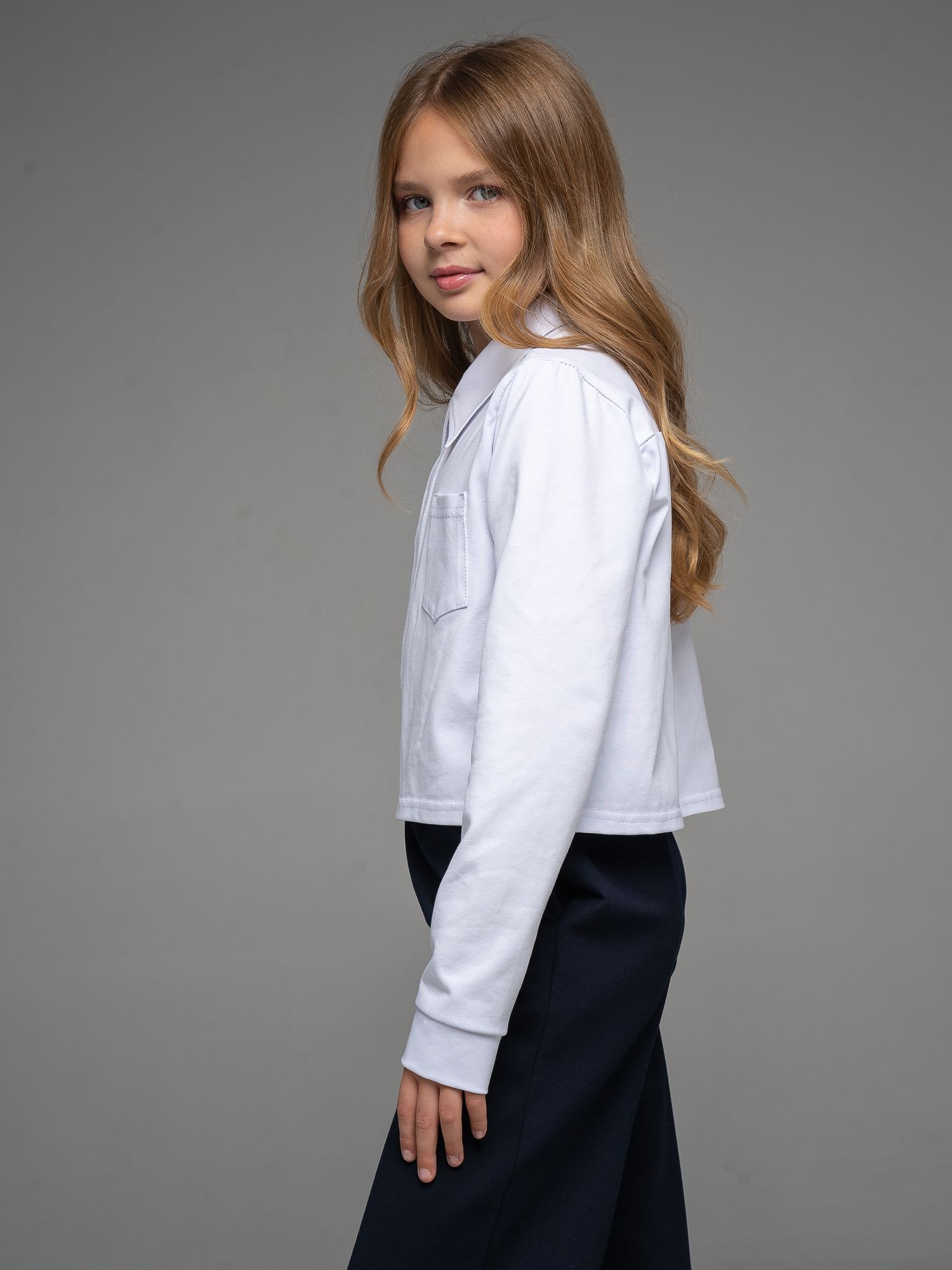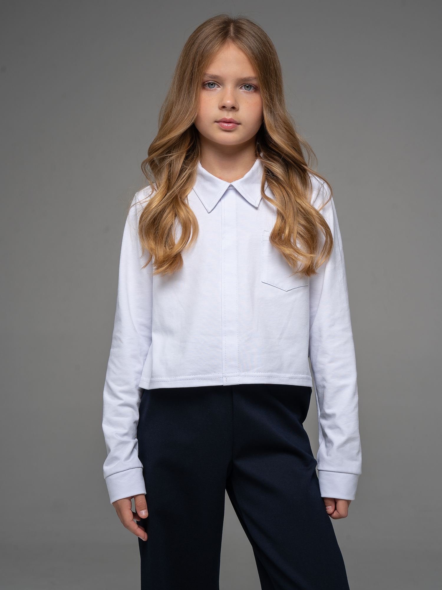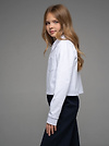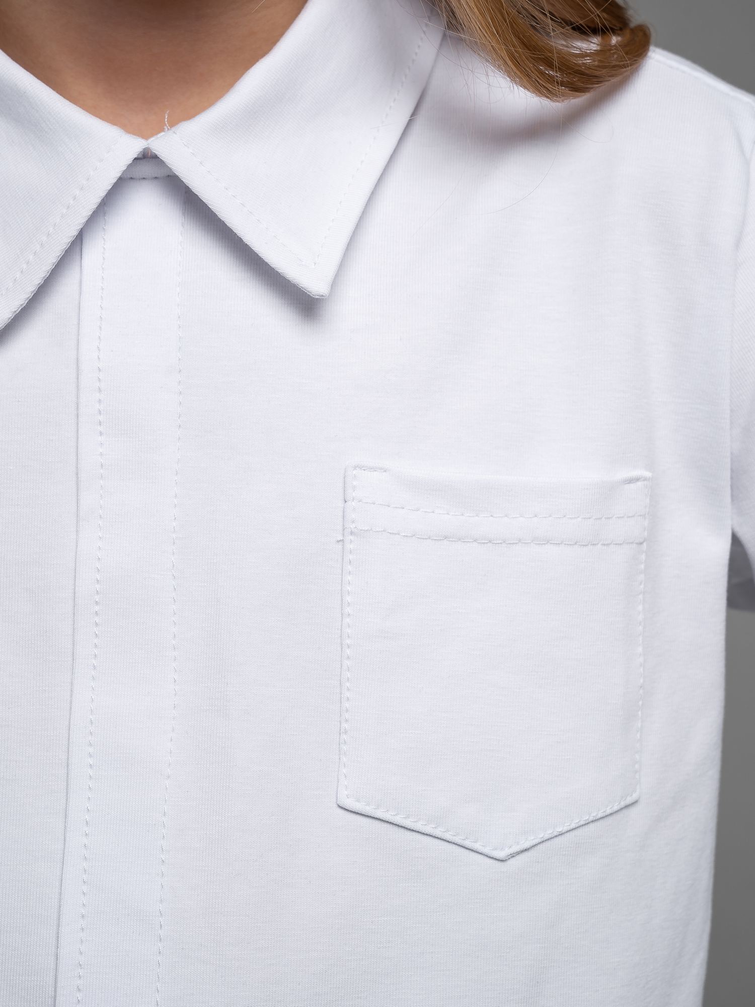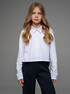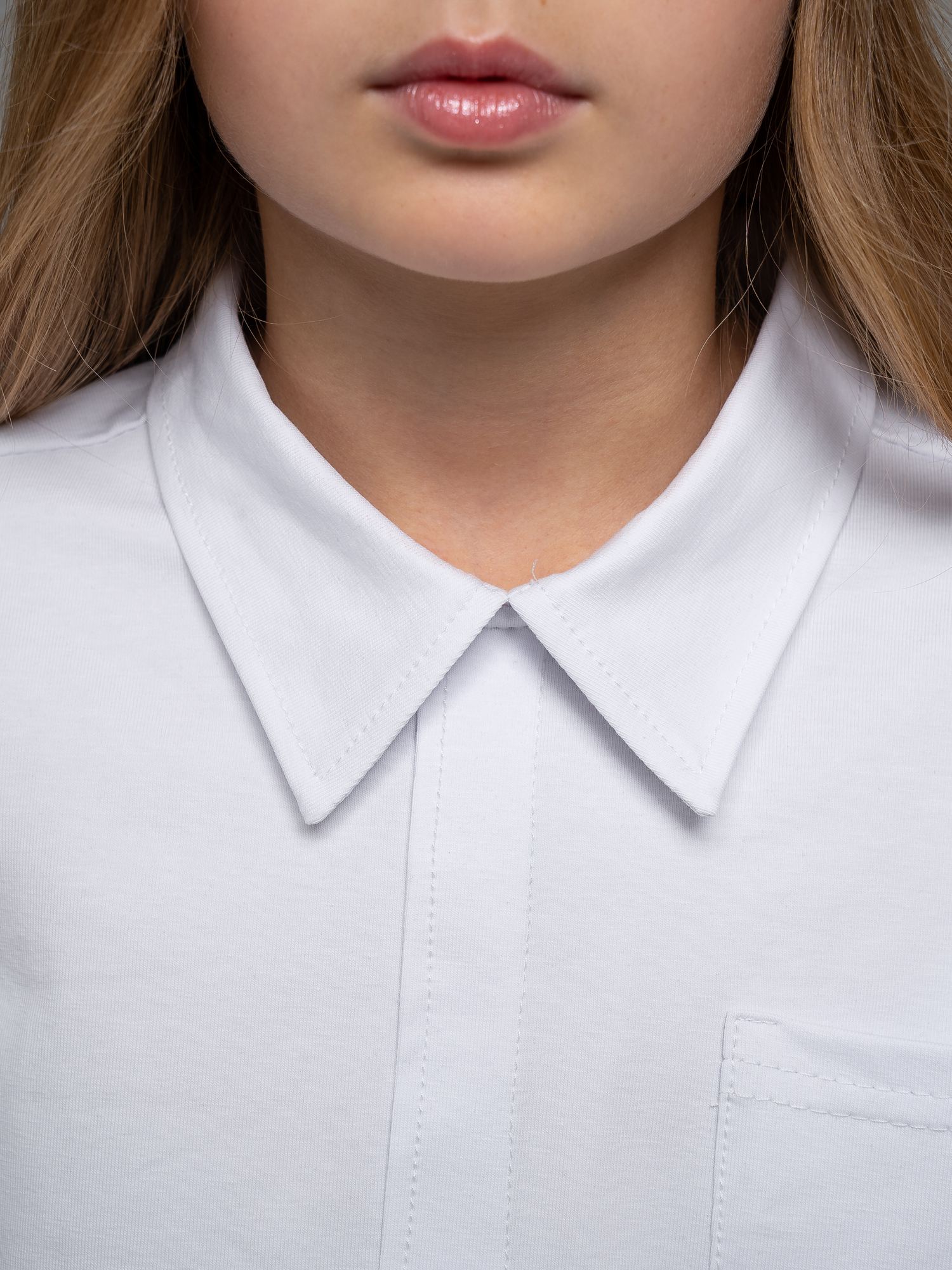 Укороченная рубашка свободного силуэта из кулирки белого цвета для девочки, с имитацией центральной застежкий, нагрудным карманом и отложным воротником. Изделие выполнено из трикотажа премиального качества - ПЕНЬЕ, с содержанием хлопка более 95%