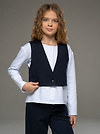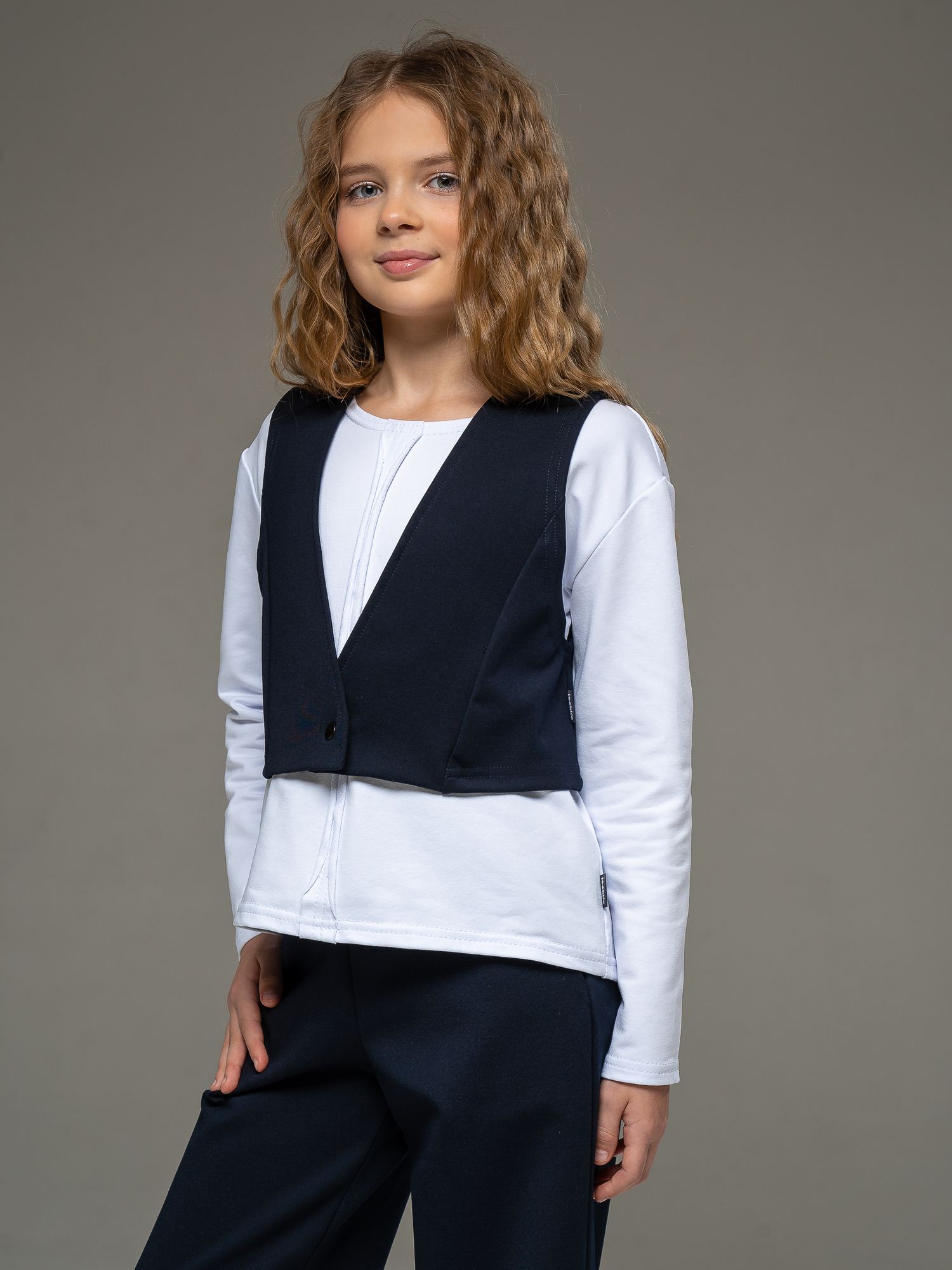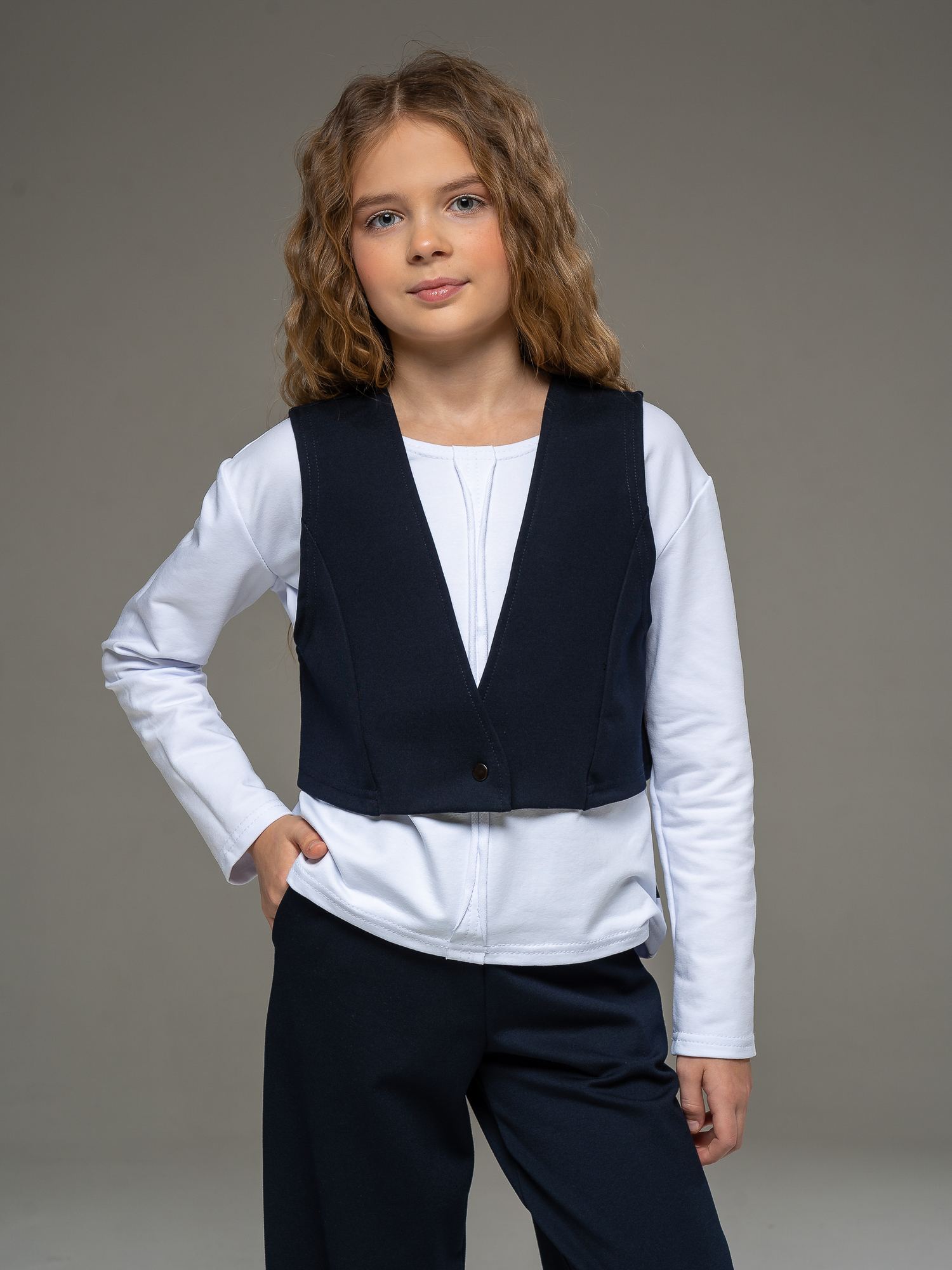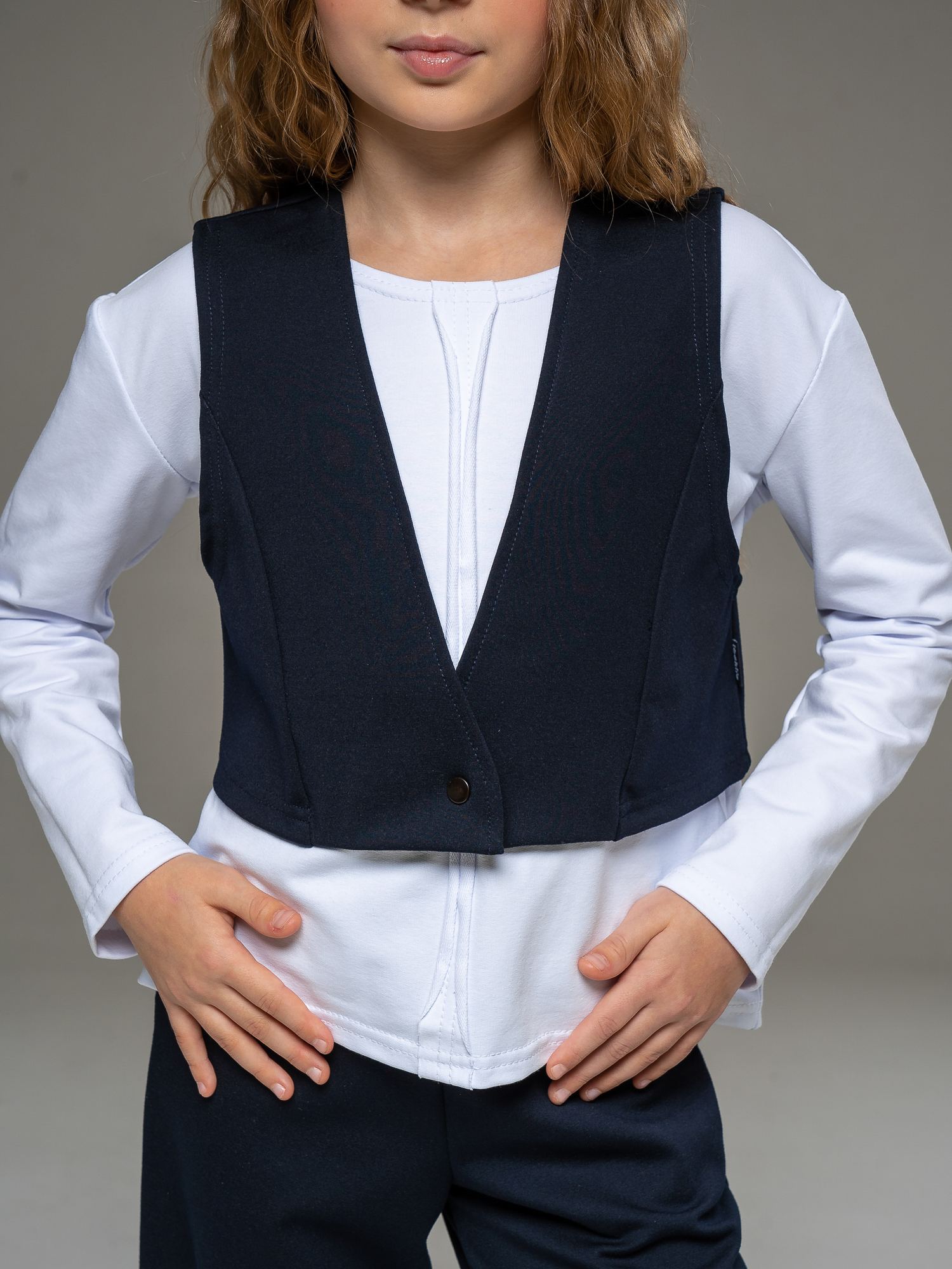 "Школьные будни – не просто обязанность, но и возможность проявить стиль и индивидуальность. Идеальным дополнением школьного гардероба вашей малышки станет укороченный жилет из джерси темно-синего цвета для девочки .