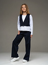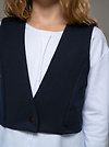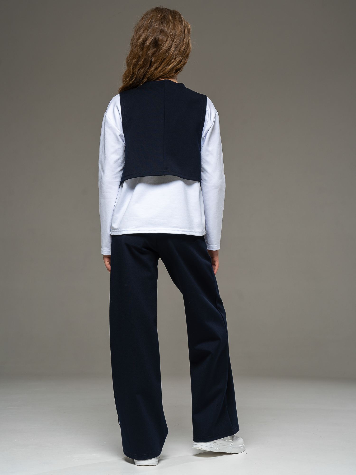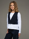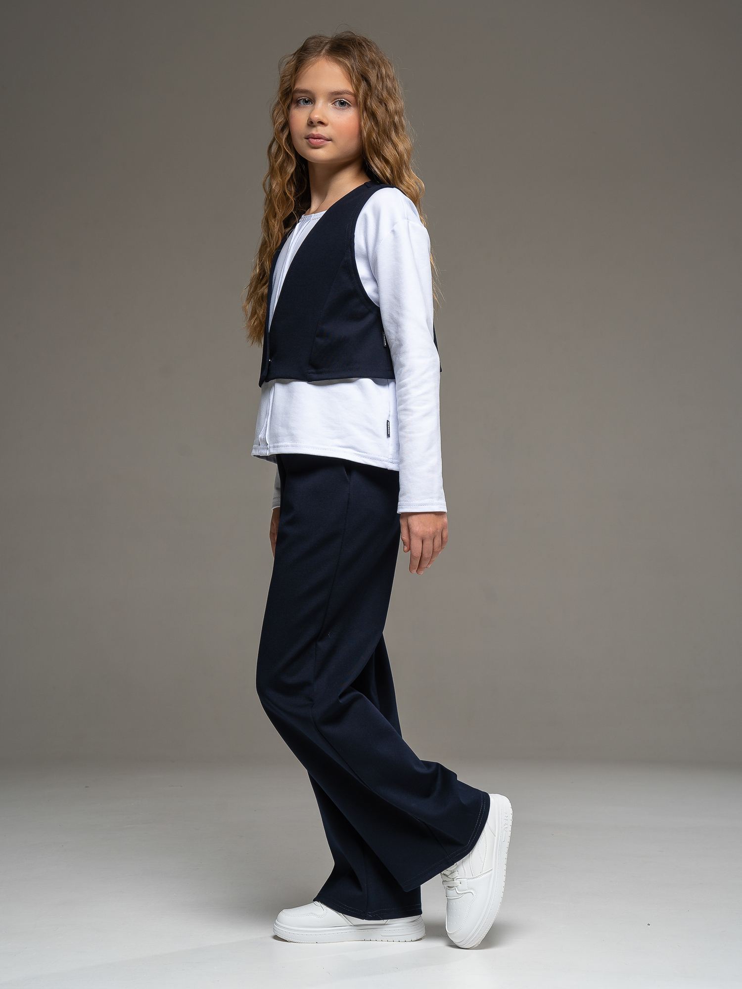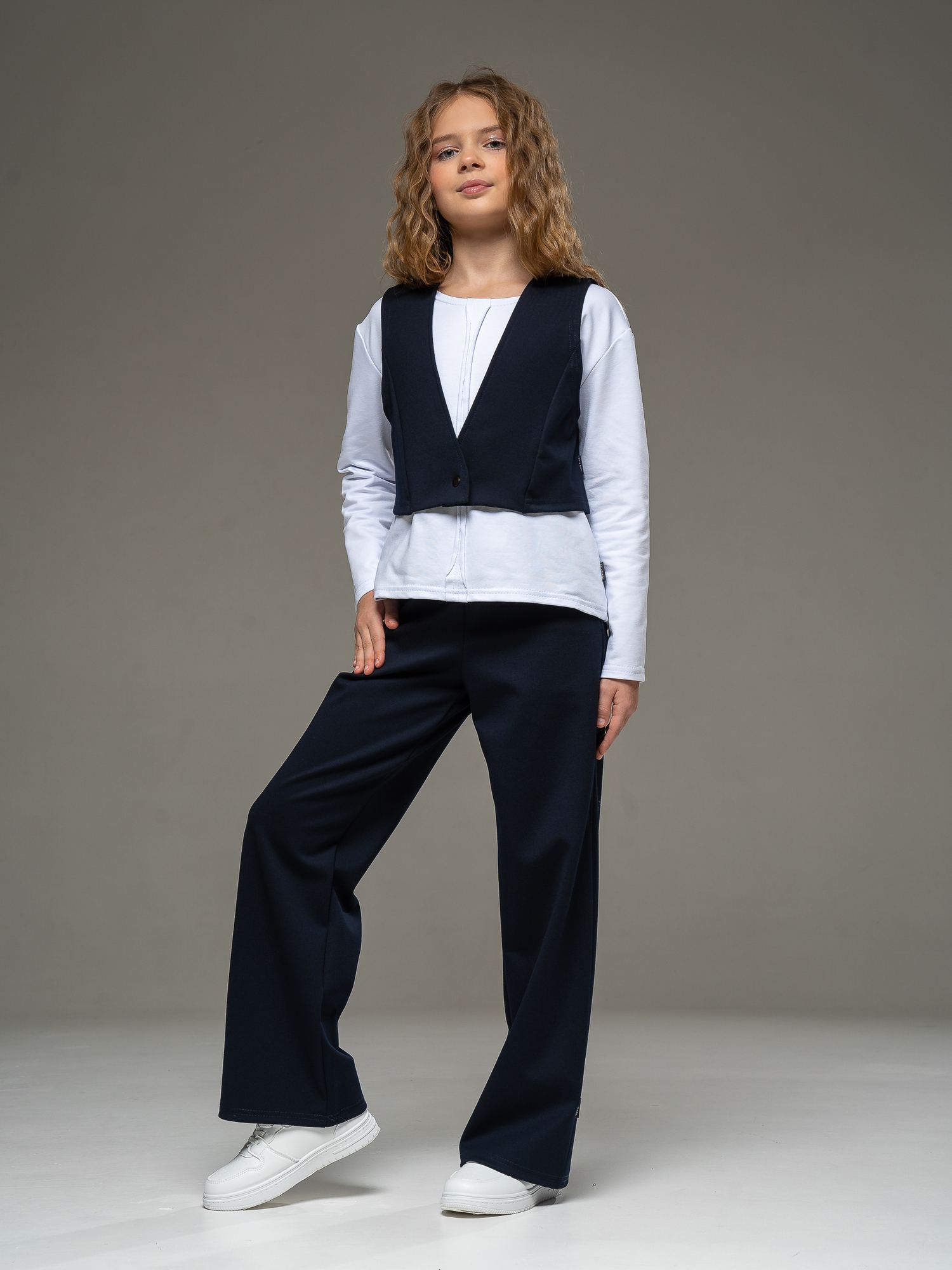 "Школьные будни – не просто обязанность, но и возможность проявить стиль и индивидуальность. Идеальным дополнением школьного гардероба вашей малышки станет укороченный жилет из джерси темно-синего цвета для девочки .