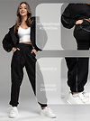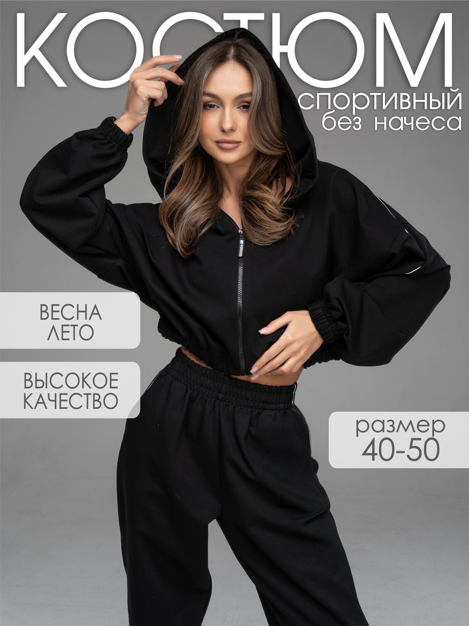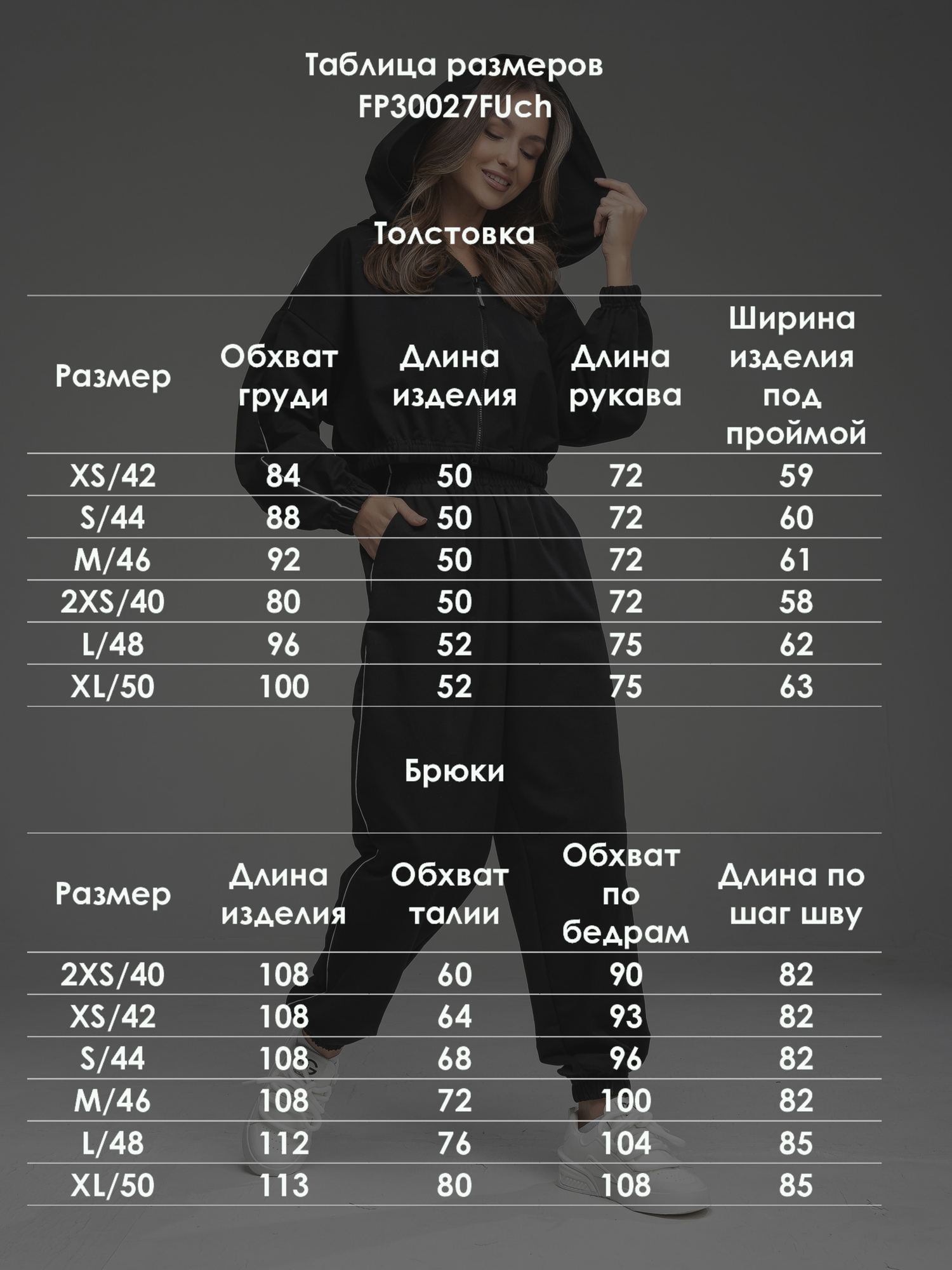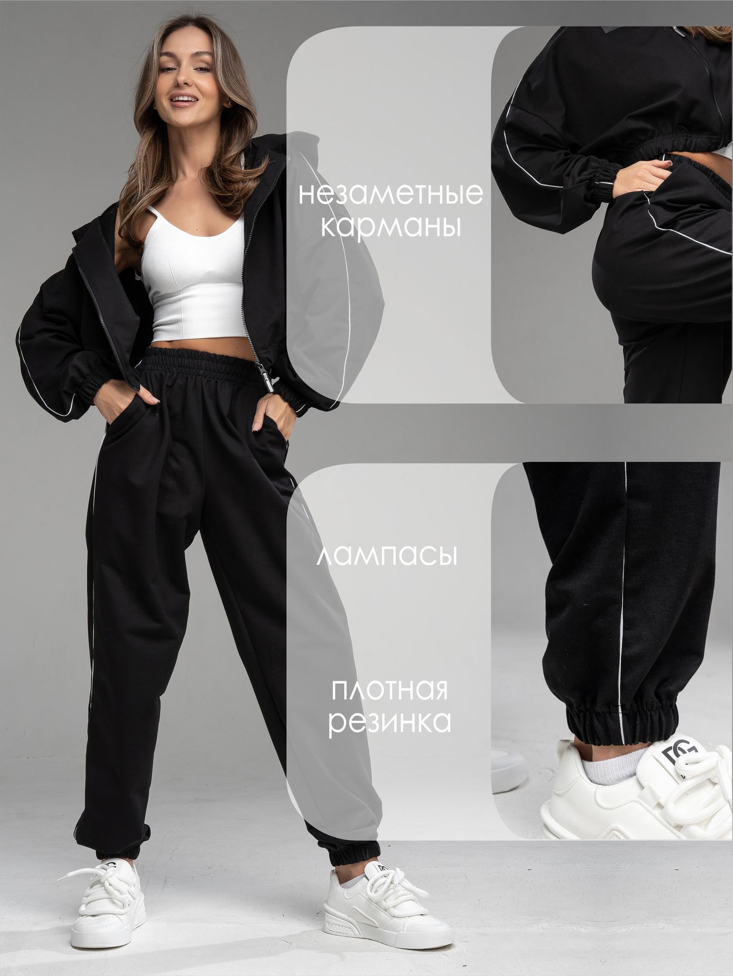Женский костюм из футера черного цвета без начеса,с стиле "Спорт-шик" состоящий из брюк и кофты с капюшоном на молнии. Толстовка укороченная на молнии свободного силуэта с капюшоном и длинными рукавами. Низ рукавов и толстовки- на резинке. По плечевому шву вставлен отделочный кант. Брюки свободного силуэта с боковыми карманами, по талии и низу изделия- резинка. В боковой шов вставлен отделочный кант. Универсальный спортивный костюм женский для повседневной жизни, выполнен из хлопкового футера 2х нитки (без начеса)- ткань средней плотности, подойдет на весну и осень, (демисезон) и прохладное лето. Наш трикотажный брючный костюм подойдет для занятий спортом, фитнеса, пилатеса, танцев и йоги. Так же в качестве спортивной формы для занятия спортом. Спортивный комплект послужит прекрасным вариантом для прогулок и походов. Хлопковая свободная двойка прекрасно смотрится на девушках разного типа фигуры и благодаря свободной кофте оверсайз подойдет и беременным девушкам. Повседневный трикотажный комплект прекрасно впишется в любой гардероб, т.к. штаны и кофту можно сочетать с любыми вещами из гардероба! Кофту на молнии и спортивки можно носить по отдельности, сочетая их с различными элементами спортивной и повседневной одежды. Плотное трикотажное полотно футер 2-х нитка без начеса, гладкое снаружи, изнутри - мягкое и приятное. В состав хлопковой ткани для эластичности и износостойкости добавлен полиэстер. Он универсален! И в поездке или путешествии будет незаменимым вариантом как на улицу, так и в спортзал. Наша стильная спортивная новинка станет удачным подарком подруге, сестре или любимой девушке на день рождения и любой другой праздник. Изделие выполнено из трикотажа премиального качества - ПЕНЬЕ, с содержанием хлопка более 92%