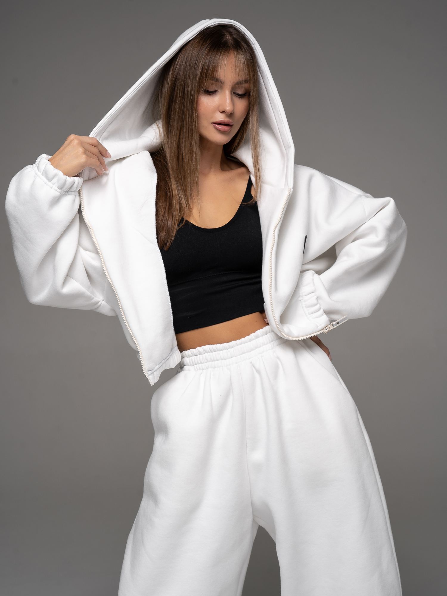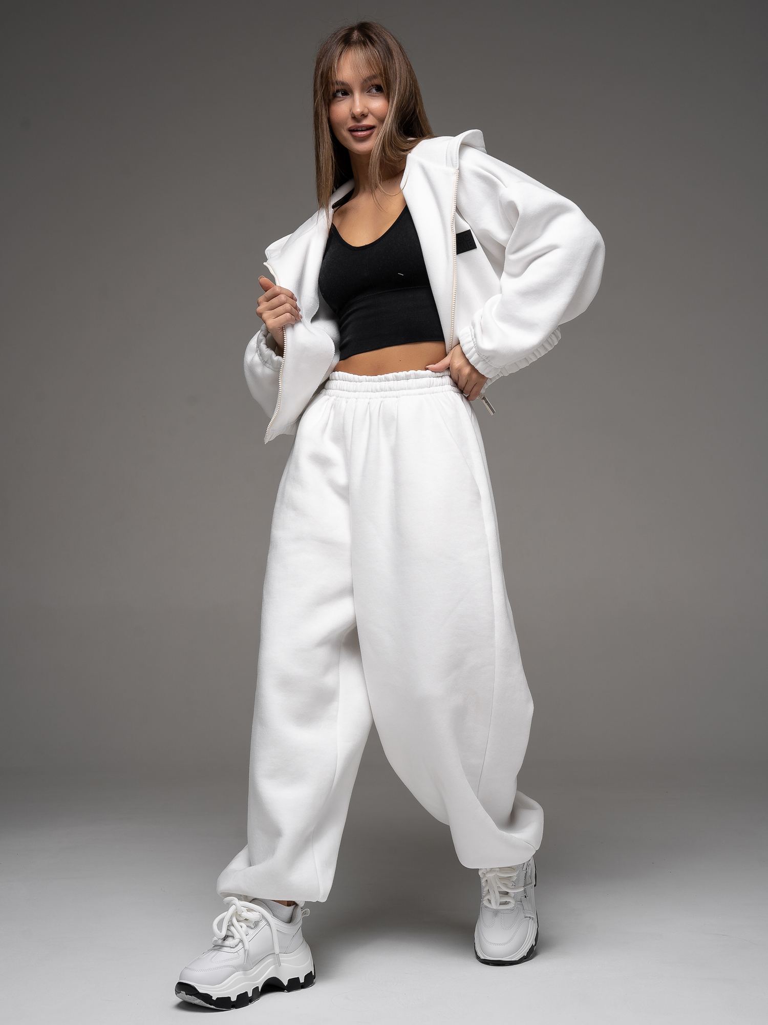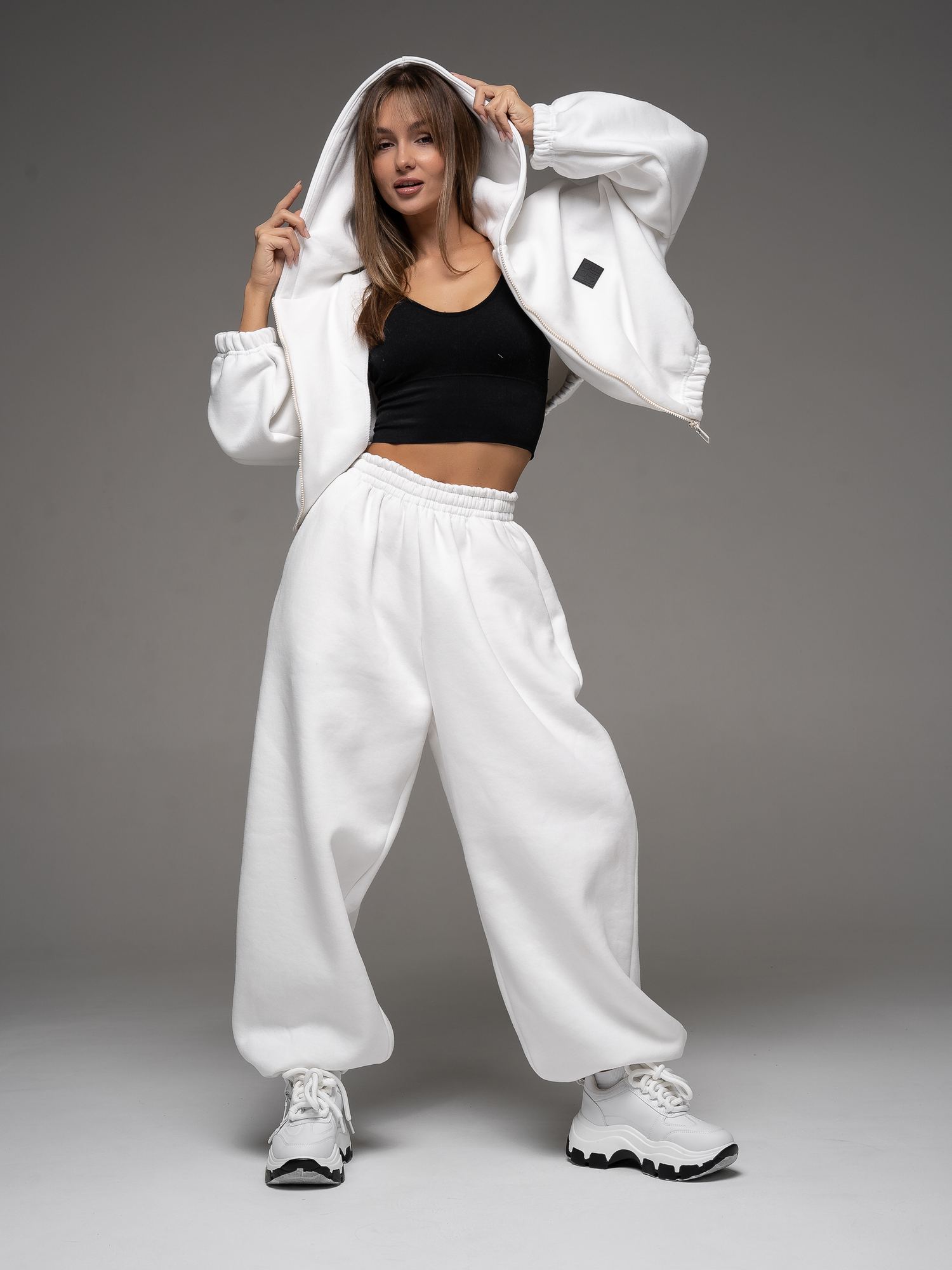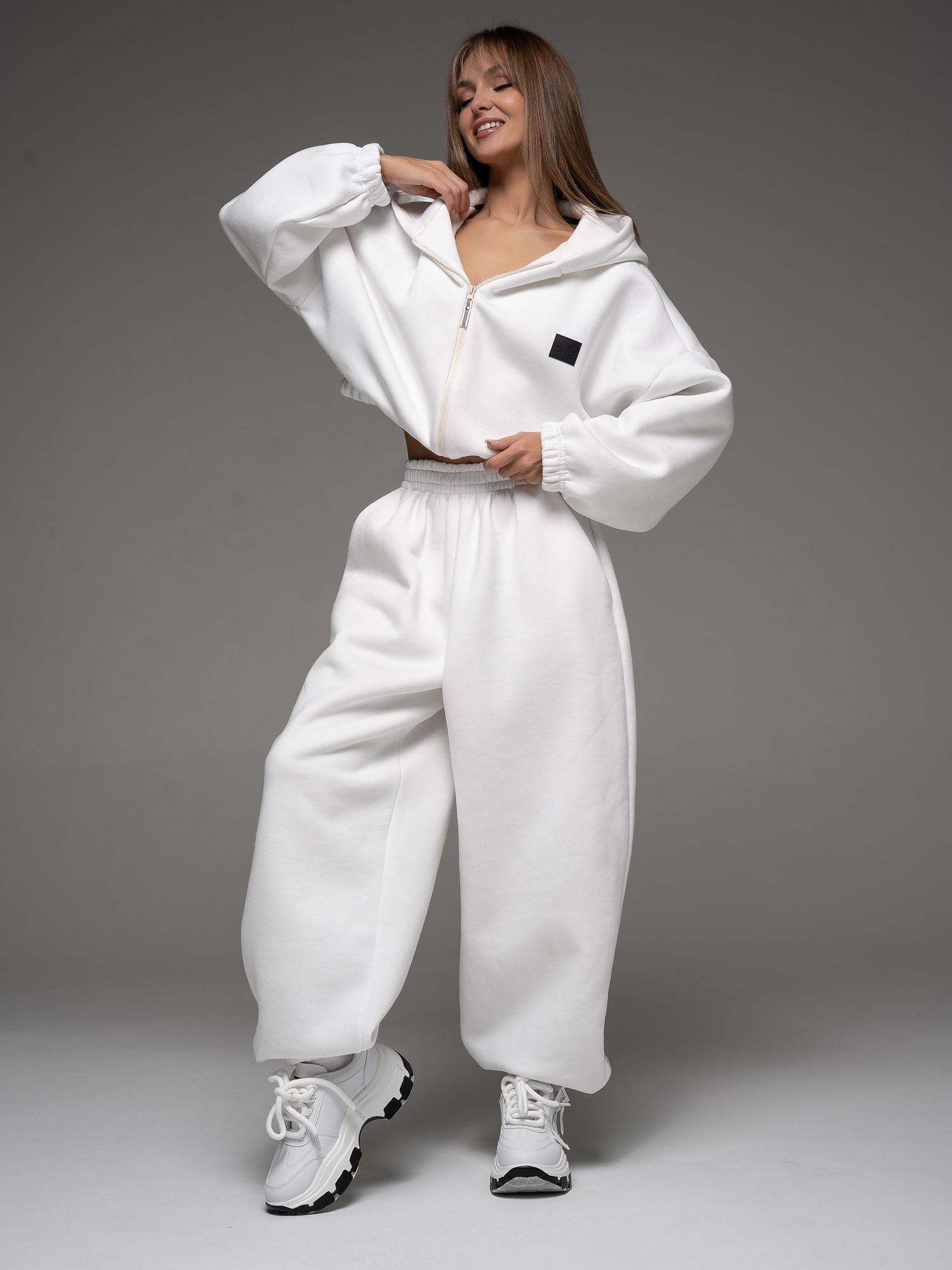 Женский костюм с начесом,с стиле "Спорт-шик" состоящий из брюк и кофты с капюшоном на молнии. Толстовка укороченная на молнии свободного силуэта с капюшоном и длинными рукавами. Низ рукавов и толстовки- на резинке. Брюки свободного силуэта с боковыми карманами, по талии и низу изделия- резинка. Универсальный спортивный костюм женский для повседневной жизни, выполнен из хлопкового футера с начесом- ткань средней плотности, подойдет на весну и осень, (демисезон) и зиму. Наш трикотажный брючный костюм подойдет для прогулок и занятий спортом. Спортивный комплект послужит прекрасным вариантом для прогулок и походов. Хлопковая свободная двойка прекрасно смотрится на девушках разного типа фигуры и благодаря свободной кофте оверсайз подойдет и беременным девушкам. Повседневный трикотажный комплект прекрасно впишется в любой гардероб, т.к. штаны и кофту можно сочетать с любыми вещами из гардероба! Кофту на молнии и спортивки можно носить по отдельности, сочетая их с различными элементами спортивной и повседневной одежды. Плотное трикотажное полотно футер с начесом, гладкое снаружи, изнутри - мягкое и приятное. В состав хлопковой ткани для эластичности и износостойкости добавлен полиэстер. Он универсален! И в поездке или путешествии будет незаменимым вариантом как на улицу, так и в спортзал. Наша стильная спортивная новинка станет удачным подарком подруге, сестре или любимой девушке на день рождения и любой другой праздник. Изделие выполнено из трикотажа премиального качества - ПЕНЬЕ, с содержанием хлопка более 80%
