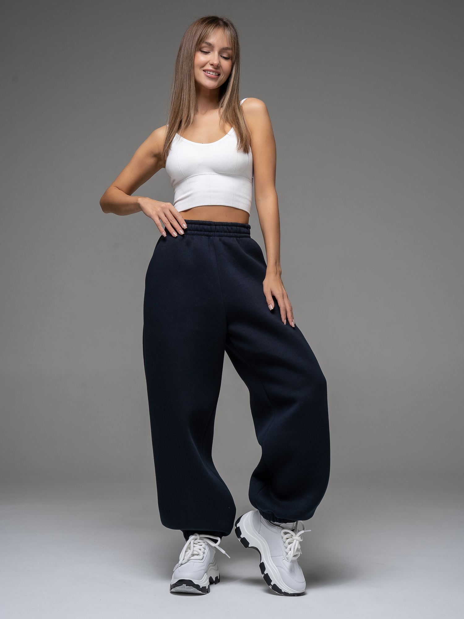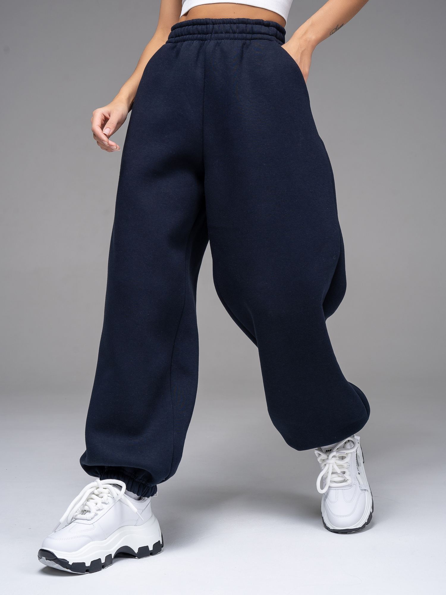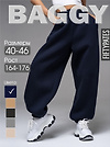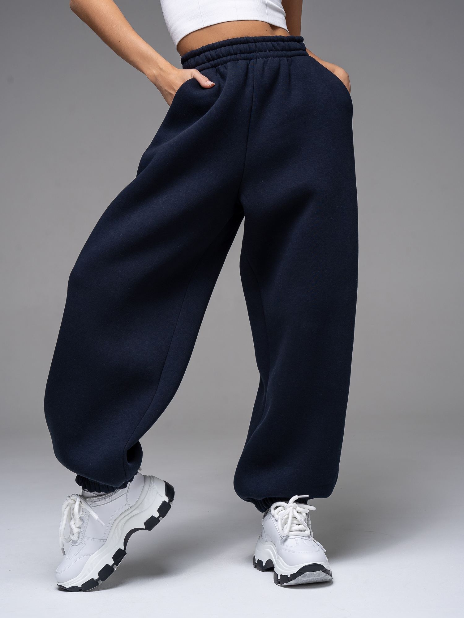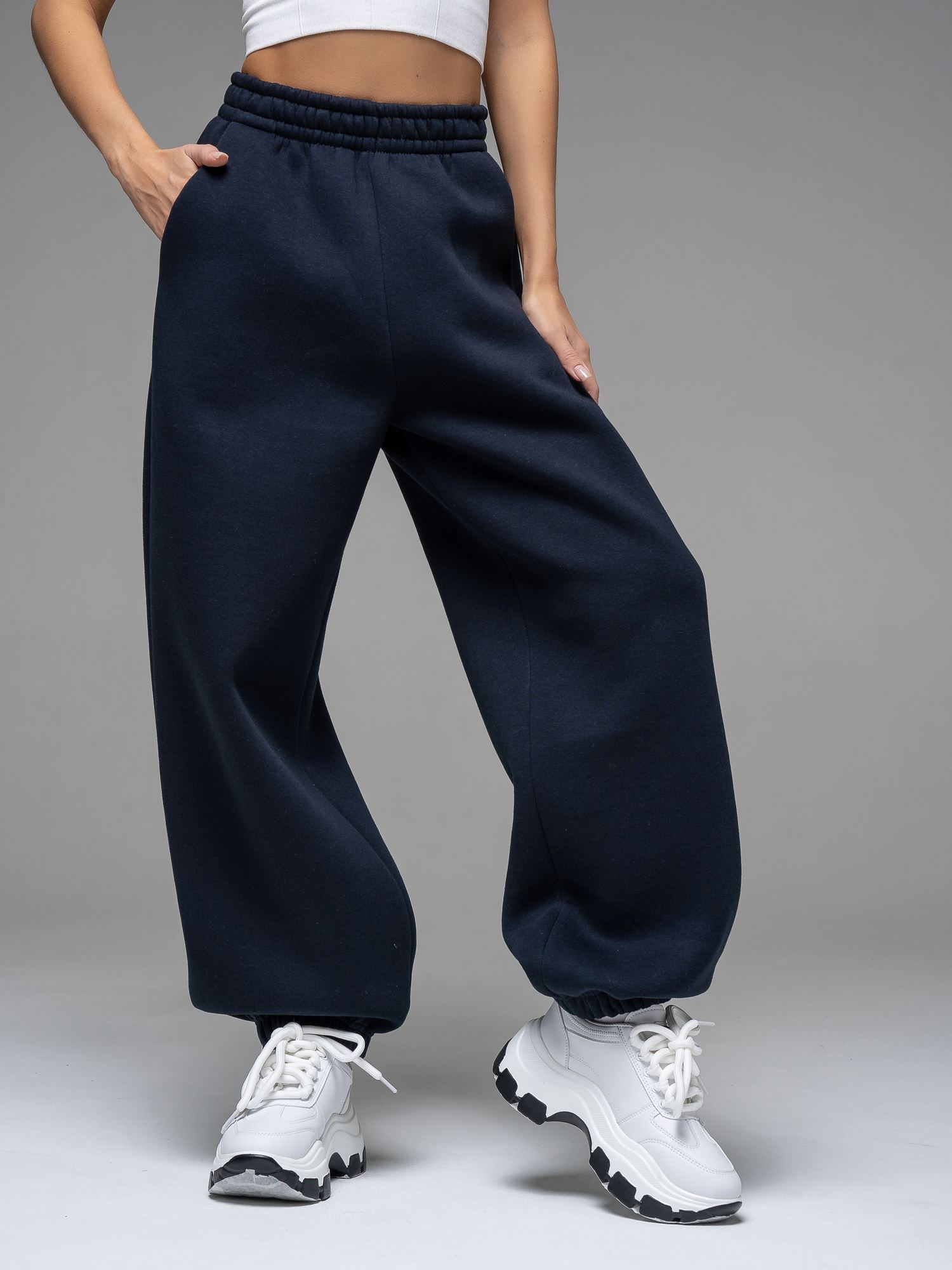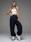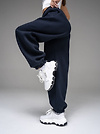 Женские брюки из футера с начесом темно-синего цвета свободного силуэта с широким цельнокроенным поясом и боковыми карманами. По низу брюк - резинка. Изделие выполнено из трикотажа премиального качества - ПЕНЬЕ, с содержанием хлопка более 80%