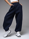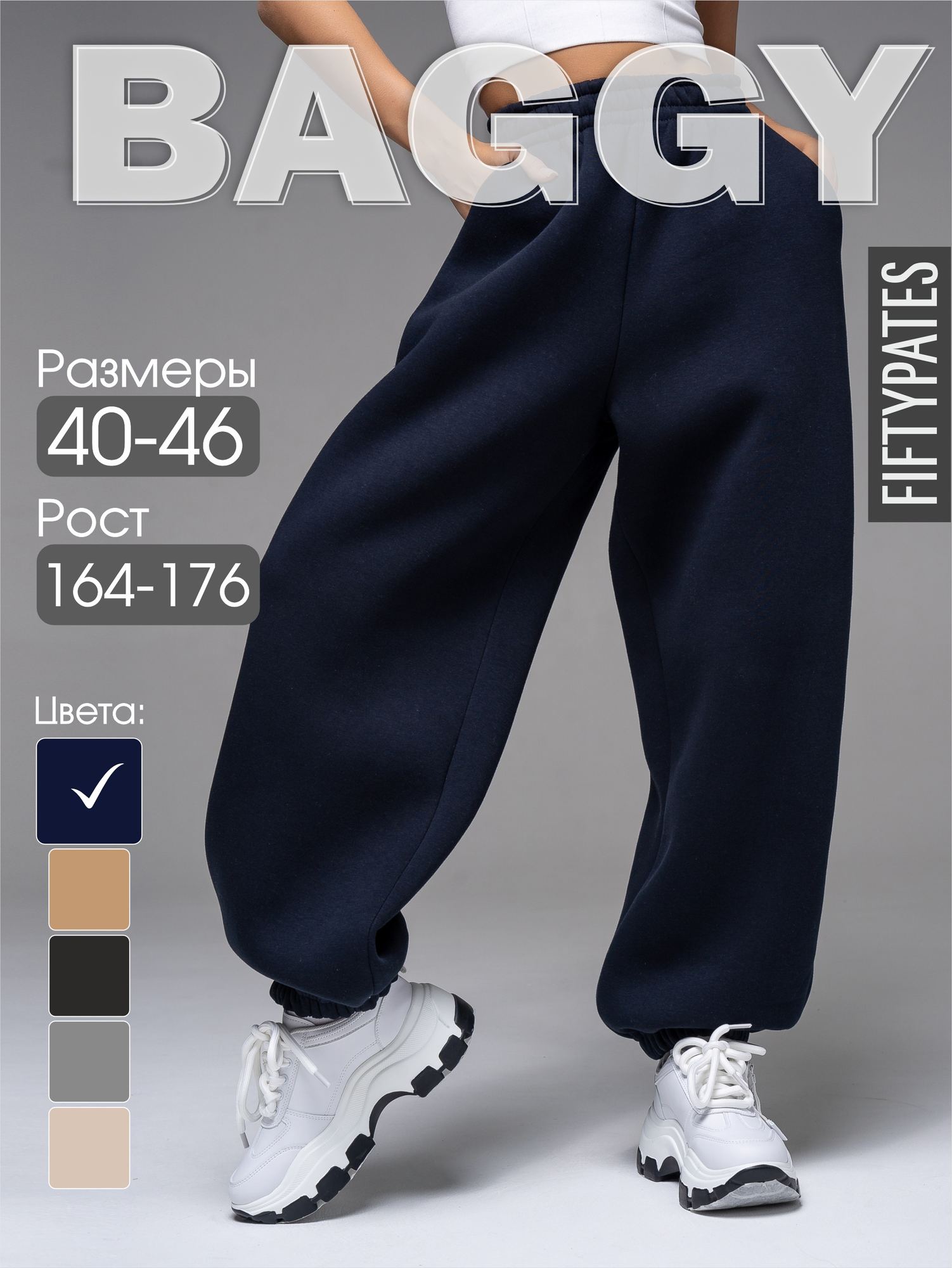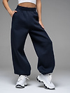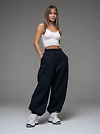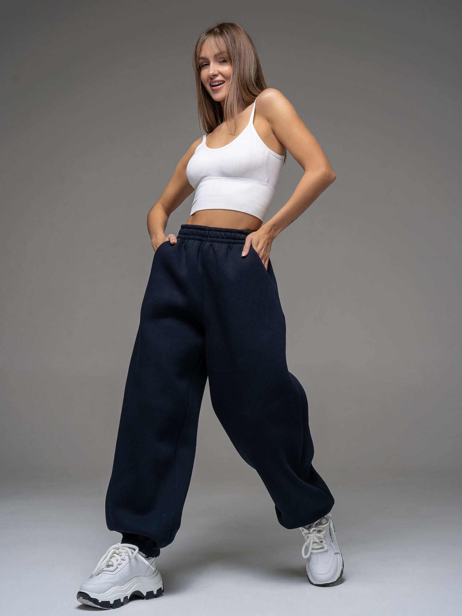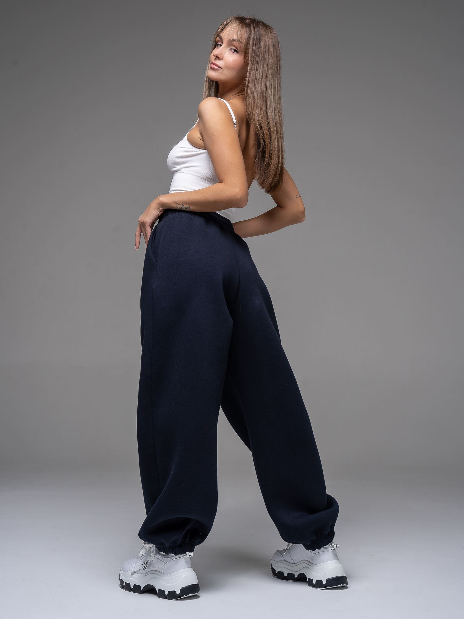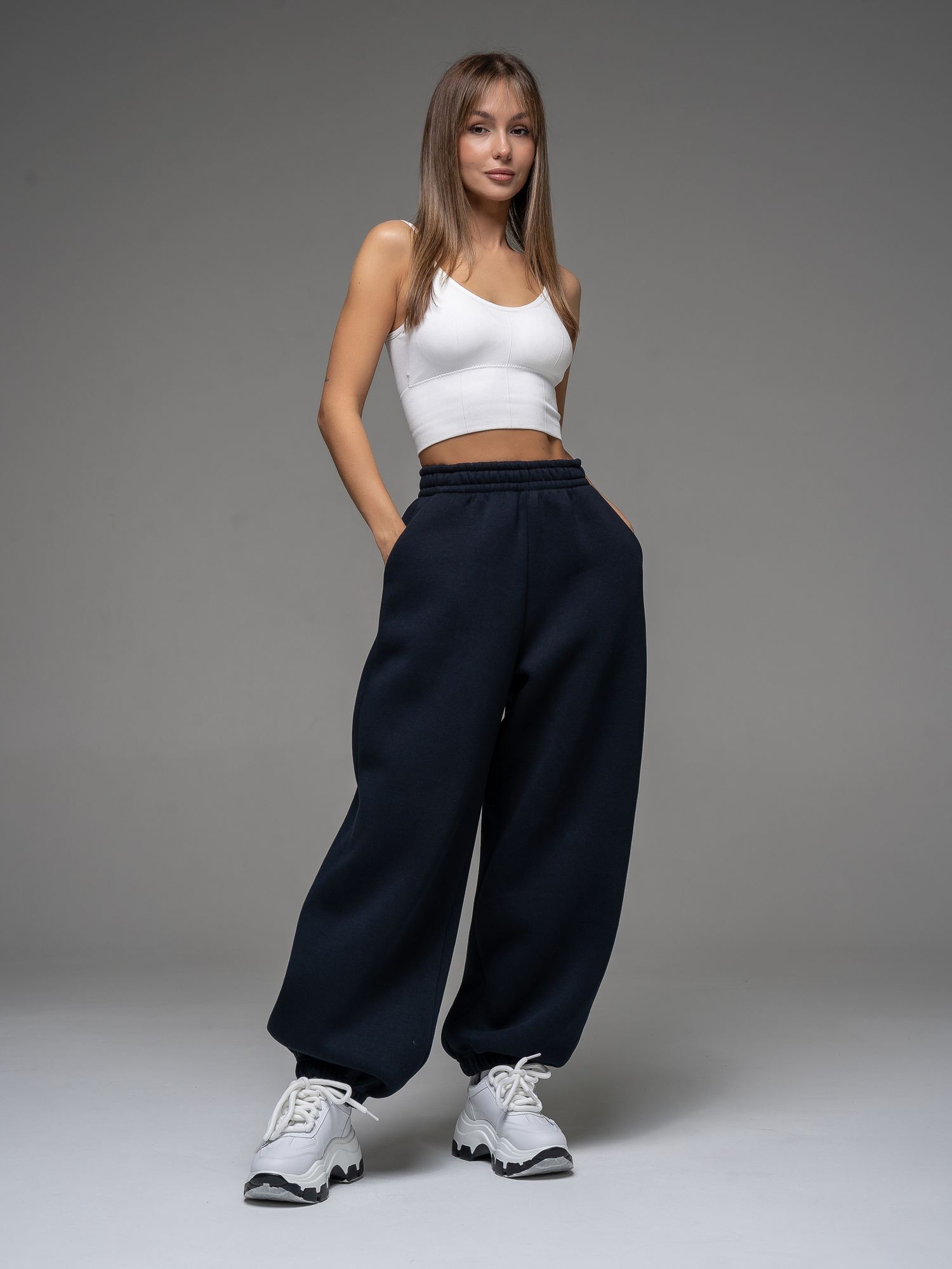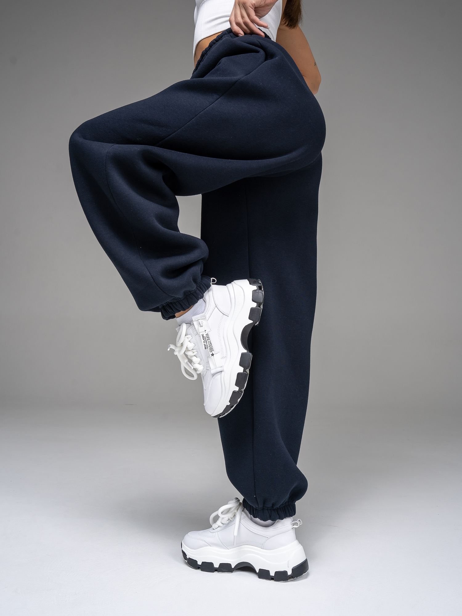 Женские брюки из футера с начесом темно-синего цвета свободного силуэта с широким цельнокроенным поясом и боковыми карманами. По низу брюк - резинка. Изделие выполнено из трикотажа премиального качества - ПЕНЬЕ, с содержанием хлопка более 80%