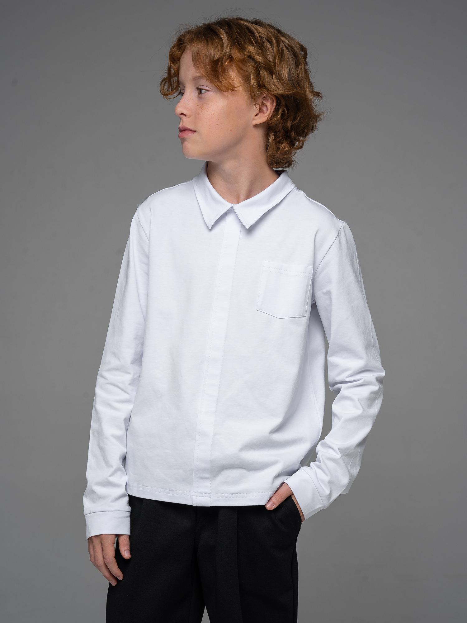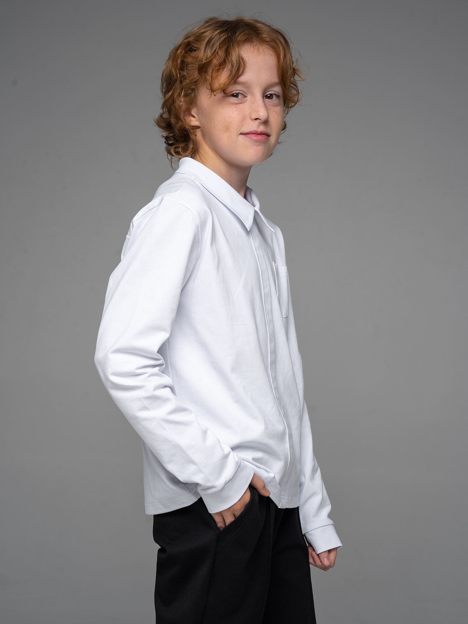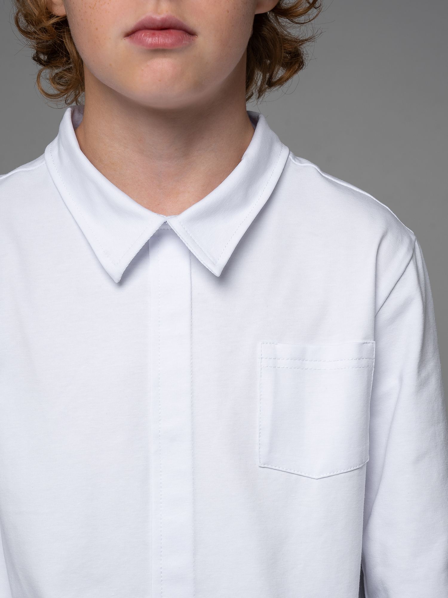 Толстовка а-ля "рубашка" из кулирки белого цвета , с центральной планкой, нагрудным карманом и отложным воротником. Изделие выполнено из трикотажа премиального качества - ПЕНЬЕ, с содержанием хлопка более 95%